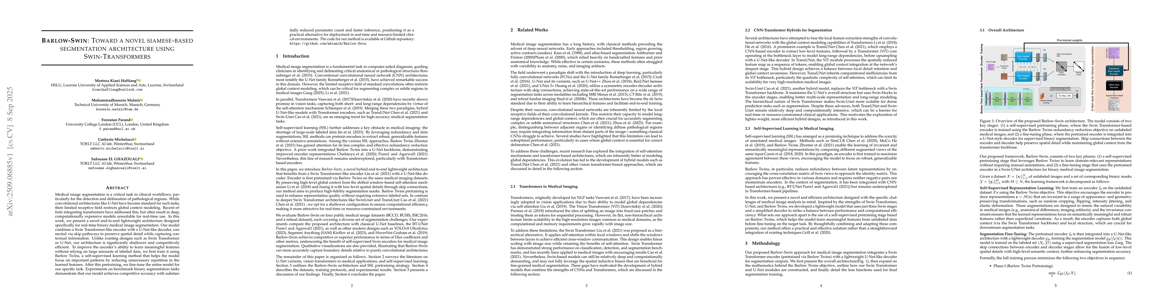 Medical image segmentation is a critical task in clinical workflows, particularly for the detection and delineation of pathological regions. While convolutional architectures like U-Net have become standard for such tasks, their limited receptive field restricts global context modeling. Recent efforts integrating transformers have addressed this, but often result in deep, computationally expensive models unsuitable for real-time use. In this work, we present a novel end-to-end lightweight architecture designed specifically for real-time binary medical image segmentation. Our model combines a Swin Transformer-like encoder with a U-Net-like decoder, connected via skip pathways to preserve spatial detail while capturing contextual information. Unlike existing designs such as Swin Transformer or U-Net, our architecture is significantly shallower and competitively efficient. To improve the encoder's ability to learn meaningful features without relying on large amounts of labeled data, we first train it using Barlow Twins, a self-supervised learning method that helps the model focus on important patterns by reducing unnecessary repetition in the learned features. After this pretraining, we fine-tune the entire model for our specific task. Experiments on benchmark binary segmentation tasks demonstrate that our model achieves competitive accuracy with substantially reduced parameter count and faster inference, positioning it as a practical alternative for deployment in real-time and resource-limited clinical environments. The code for our method is available at Github repository: https://github.com/mkianih/Barlow-Swin.