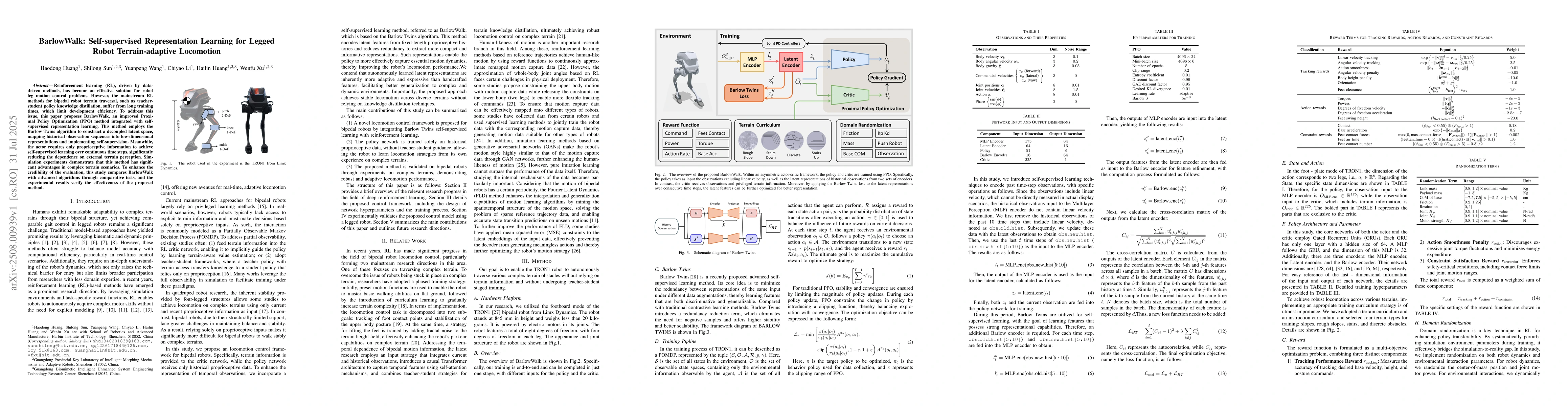 Reinforcement learning (RL), driven by data-driven methods, has become an effective solution for robot leg motion control problems. However, the mainstream RL methods for bipedal robot terrain traversal, such as teacher-student policy knowledge distillation, suffer from long training times, which limit development efficiency. To address this issue, this paper proposes BarlowWalk, an improved Proximal Policy Optimization (PPO) method integrated with self-supervised representation learning. This method employs the Barlow Twins algorithm to construct a decoupled latent space, mapping historical observation sequences into low-dimensional representations and implementing self-supervision. Meanwhile, the actor requires only proprioceptive information to achieve self-supervised learning over continuous time steps, significantly reducing the dependence on external terrain perception. Simulation experiments demonstrate that this method has significant advantages in complex terrain scenarios. To enhance the credibility of the evaluation, this study compares BarlowWalk with advanced algorithms through comparative tests, and the experimental results verify the effectiveness of the proposed method.