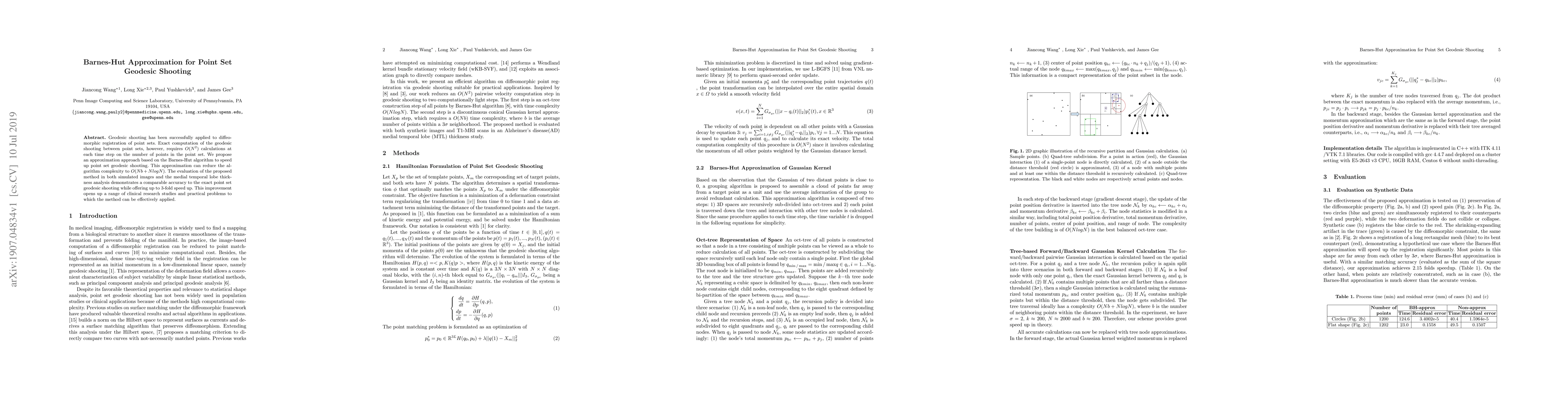 The paper proposes a Barnes-Hut approximation to speed up point set geodesic shooting, reducing algorithm complexity from O(N^2) to O(N^b + N log N).