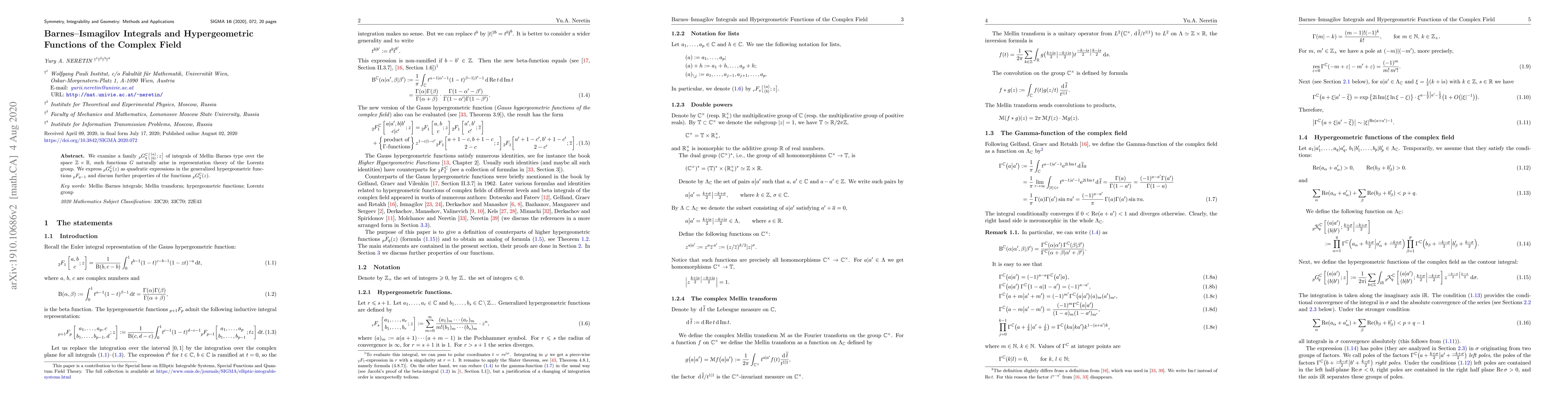 This paper investigates Barnes-Ismagilov integrals of Mellin-Barnes type, which arise in representation theory of the Lorentz group. The authors express these integrals as quadratic expressions in generalized hypergeometric functions and explore their properties.