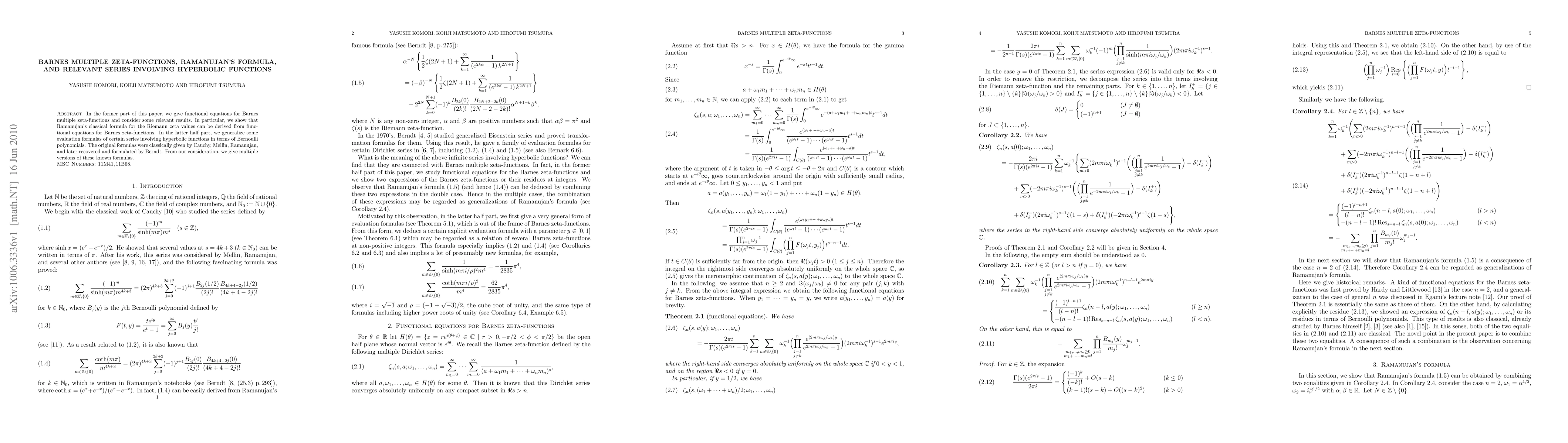 This paper presents functional equations for Barnes multiple zeta-functions and derives Ramanujan's formula for Riemann zeta values from them. It also generalizes evaluation formulas for series involving hyperbolic functions, linking them to Bernoulli polynomials and providing multiple versions of known results.