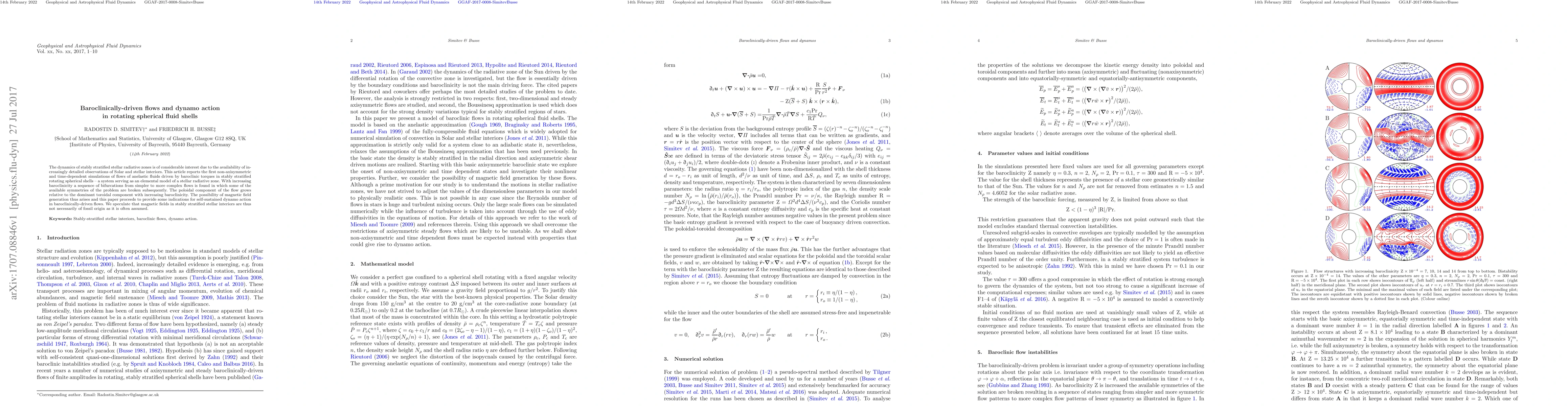 The dynamics of stably stratified stellar radiative zones is of considerable interest due to the availability of increasingly detailed observations of Solar and stellar interiors. This article reports the first non-axisymmetric and time-dependent simulations of flows of anelastic fluids driven by baroclinic torques in stably stratified rotating spherical shells -- a system serving as an elemental model of a stellar radiative zone. With increasing baroclinicity a sequence of bifurcations from simpler to more complex flows is found in which some of the available symmetries of the problem are broken subsequently. The poloidal component of the flow grows relative to the dominant toroidal component with increasing baroclinicity. The possibility of magnetic field generation thus arises and this paper proceeds to provide some indications for self-sustained dynamo action in baroclinically-driven flows. We speculate that magnetic fields in stably stratified stellar interiors are thus not necessarily of fossil origin as it is often assumed.