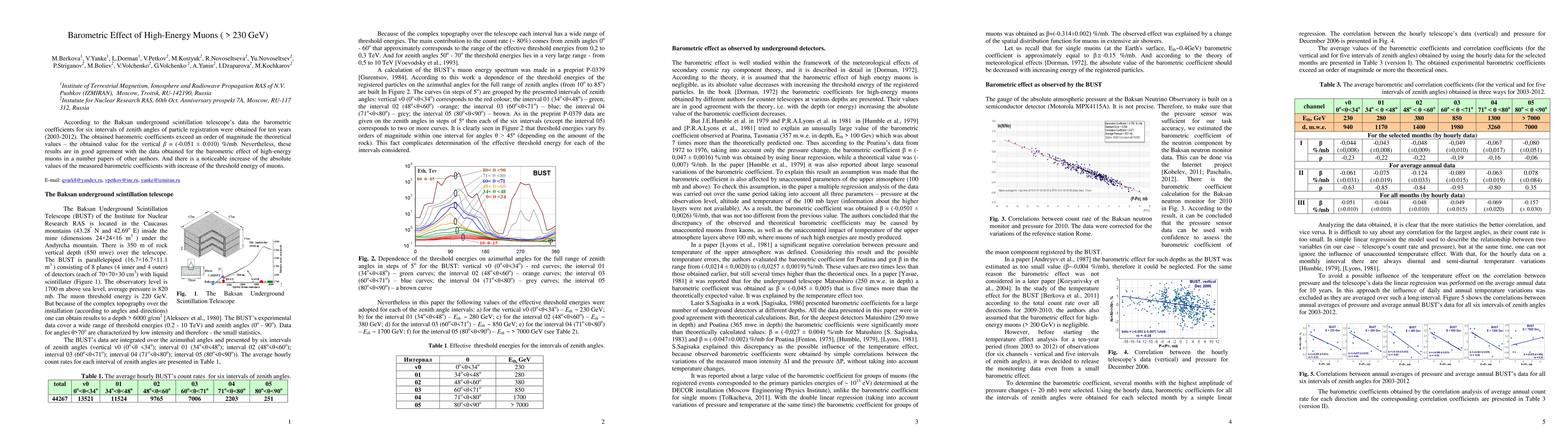 The Baksan underground scintillation telescope data, spanning 2003-2012, reveals barometric coefficients for high-energy muons (>230 GeV) over six zenith angle intervals. These coefficients are significantly higher than theoretical predictions but align with other authors' findings, with a notable rise in coefficient values as the muon energy threshold increases.