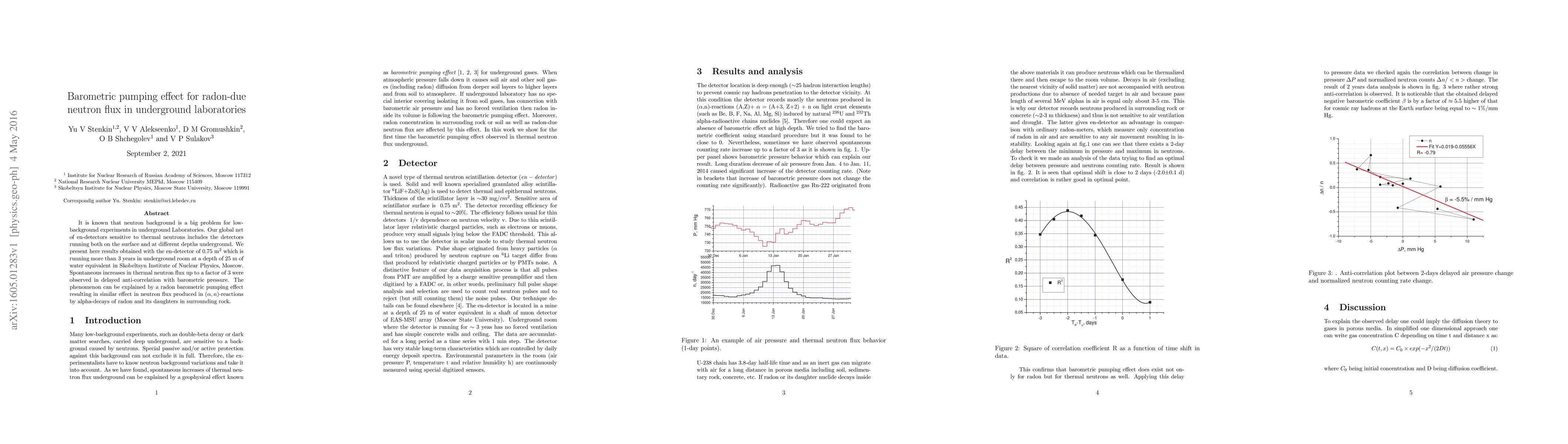 It is known that neutron background is a big problem for low-background experiments in underground Laboratories. Our global net of en-detectors sensitive to thermal neutrons includes the detectors running both on the surface and at different depths underground. We present here results obtained with the en-detector of 0.75 m^2 which is running more than 3 years in underground room at a depth of 25 m of water equivalent in Skobeltsyn Institute of Nuclear Physics, Moscow. Spontaneous increases in thermal neutron flux up to a factor of 3 were observed in delayed anti-correlation with barometric pressure. The phenomenon can be explained by a radon barometric pumping effect resulting in similar effect in neutron flux produced in (alpha,n)-reactions by alpha-decays of radon and its daughters in surrounding rock