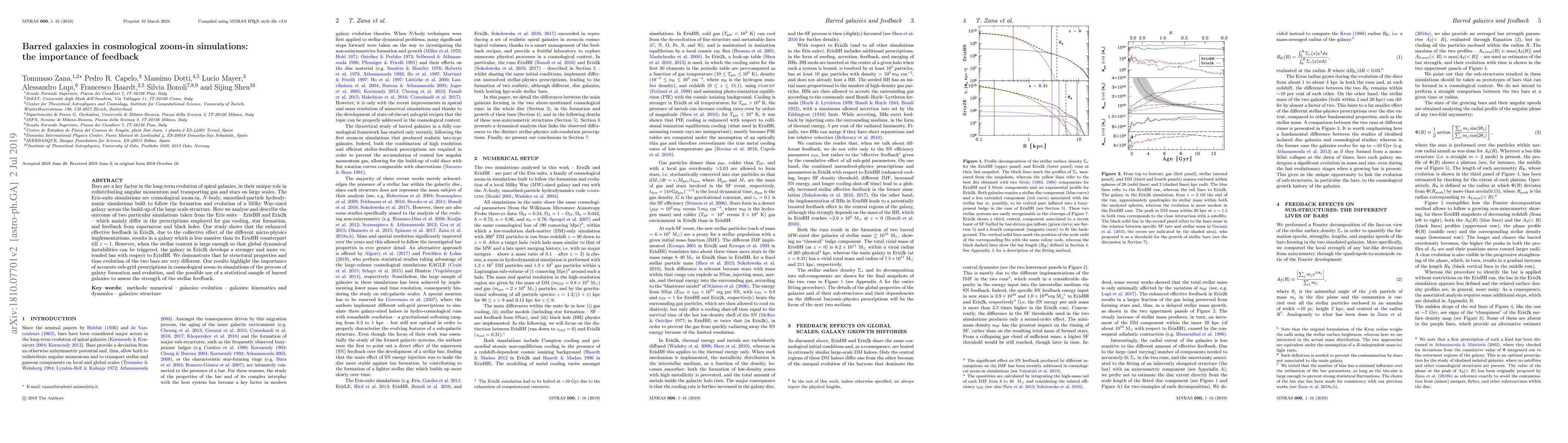 This study compares two cosmological zoom-in simulations, ErisBH and Eris2k, which differ in feedback prescriptions. The simulations follow the formation and evolution of a Milky Way-sized galaxy, focusing on barred galaxy formation and the impact of feedback.