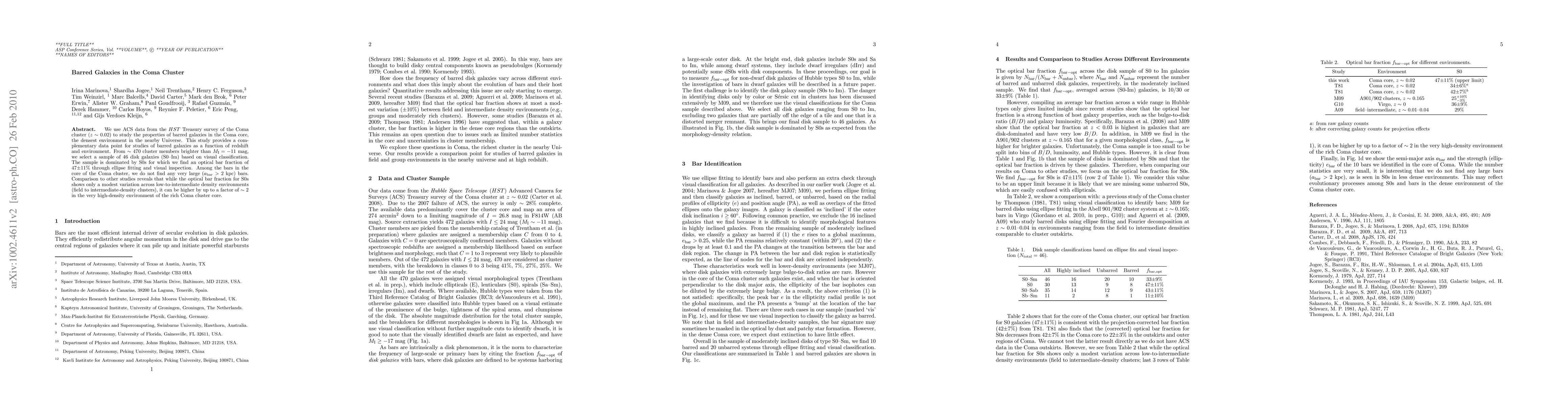 This study analyzes ACS data from the HST Treasury survey to investigate barred galaxies in the Coma cluster core, finding a high bar fraction of 47% in S0 galaxies, with no very large bars. The bar fraction in dense environments like Coma is significantly higher than in less dense regions.