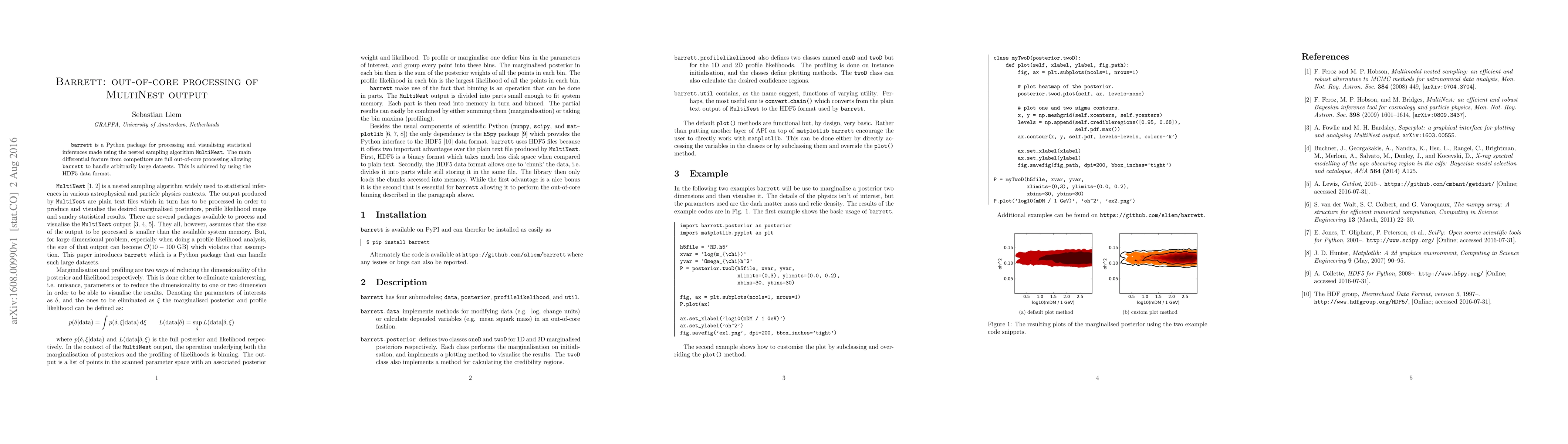 Barrett is a Python package for processing and visualising statistical inferences made using the nested sampling algorithm MultiNest. The main differential feature from competitors are full out-of-core processing allowing barrett to handle arbitrarily large datasets. This is achieved by using the HDF5 data format.