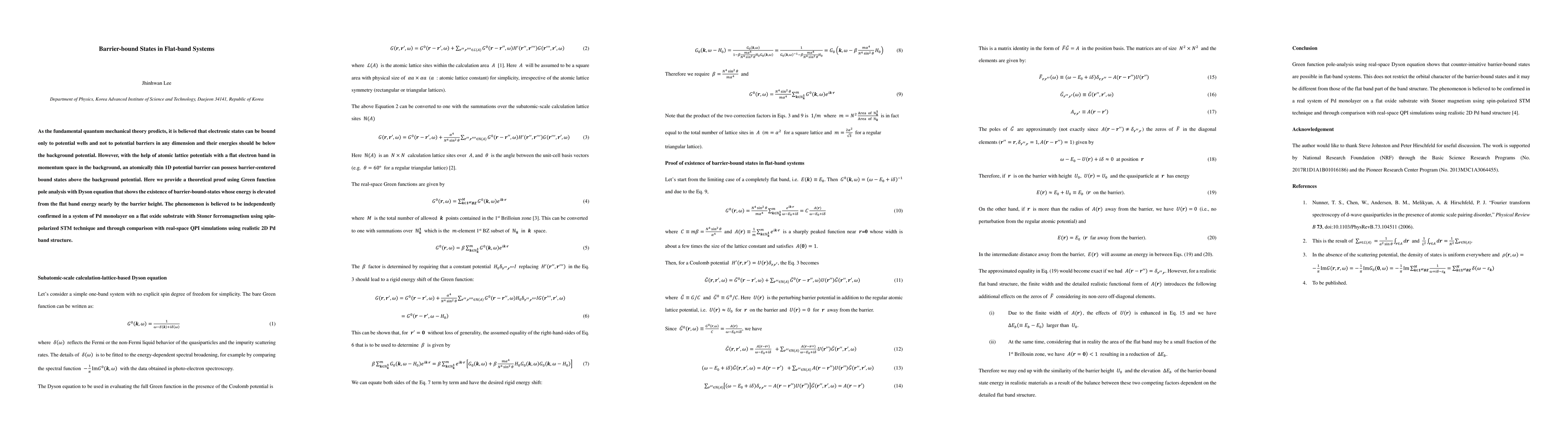 As the fundamental quantum mechanical theory predicts, it is believed that electronic states can be bound only to potential wells and not to potential barriers in any dimension and their energies should be below the background potential. However, with the help of atomic lattice potentials with a flat electron band in momentum space in the background, an atomically thin 1D potential barrier can possess barrier-centered bound states above the background potential. Here we provide a theoretical proof using Green function pole analysis with Dyson equation that shows the existence of barrier-bound-states whose energy is elevated from the flat band energy nearly by the barrier height. The phenomenon is believed to be independently confirmed in a system of Pd monolayer on a flat oxide substrate with Stoner ferromagnetism using spin-polarized STM technique and through comparison with real-space QPI simulations using realistic 2D Pd band structure.