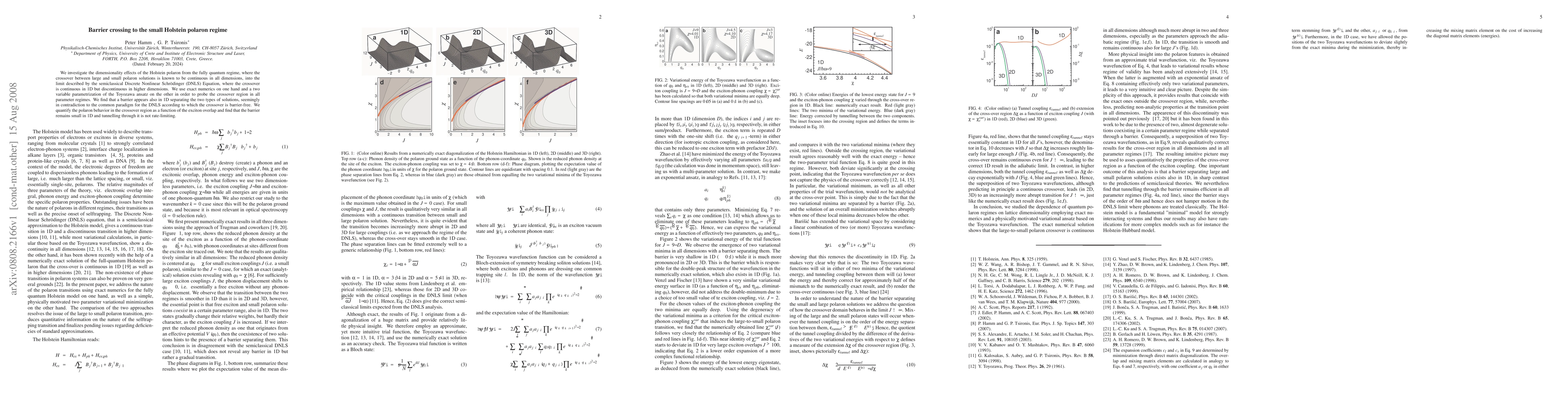 We investigate the dimensionality effects of the Holstein polaron from the fully quantum regime, where the crossover between large and small polaron solutions is known to be continuous in all dimensions, into the limit described by the semiclassical Discrete Nonlinear Schr\"odinger (DNLS) Equation, where the crossover is continuous in 1D but discontinuous in higher dimensions. We use exact numerics on one hand and a two variable parametrization of the Toyozawa ansatz on the other in order to probe the crossover region in all parameter regimes. We find that a barrier appears also in 1D separating the two types of solutions, seemingly in contradiction to the common paradigm for the DNLS according to which the crossover is barrier-free. We quantify the polaron behavior in the crossover region as a function of the exciton overlap and find that the barrier remains small in 1D and tunnelling through it is not rate-limiting.