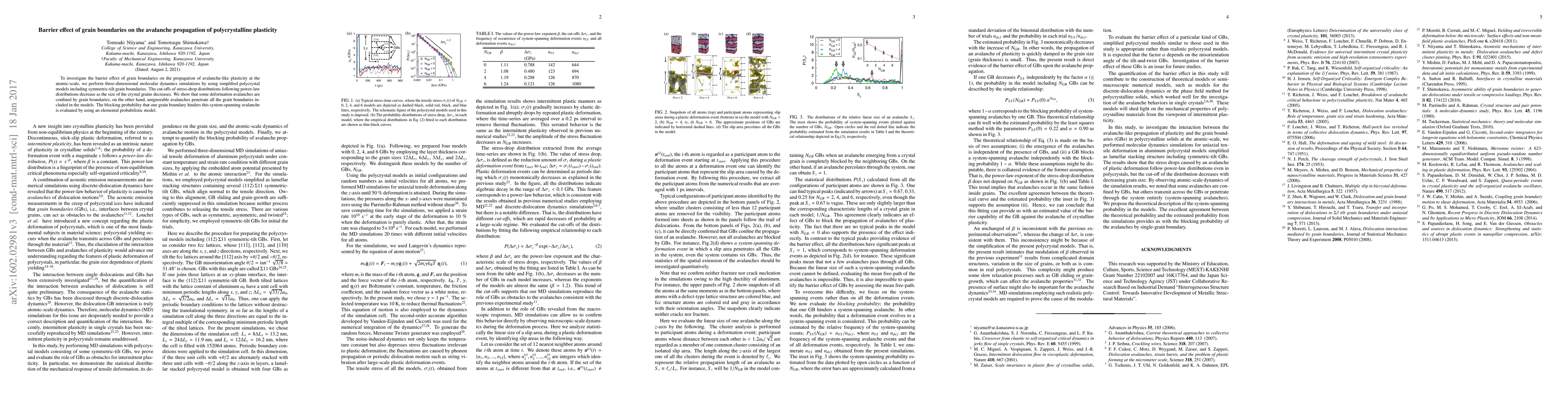This research investigates the barrier effect of grain boundaries on atomic-scale avalanche-like plasticity in polycrystalline materials using molecular dynamics simulations. The study finds that while some deformation avalanches are confined by grain boundaries, others penetrate them, and evaluates the probability of a single grain boundary blocking system-spanning avalanches.