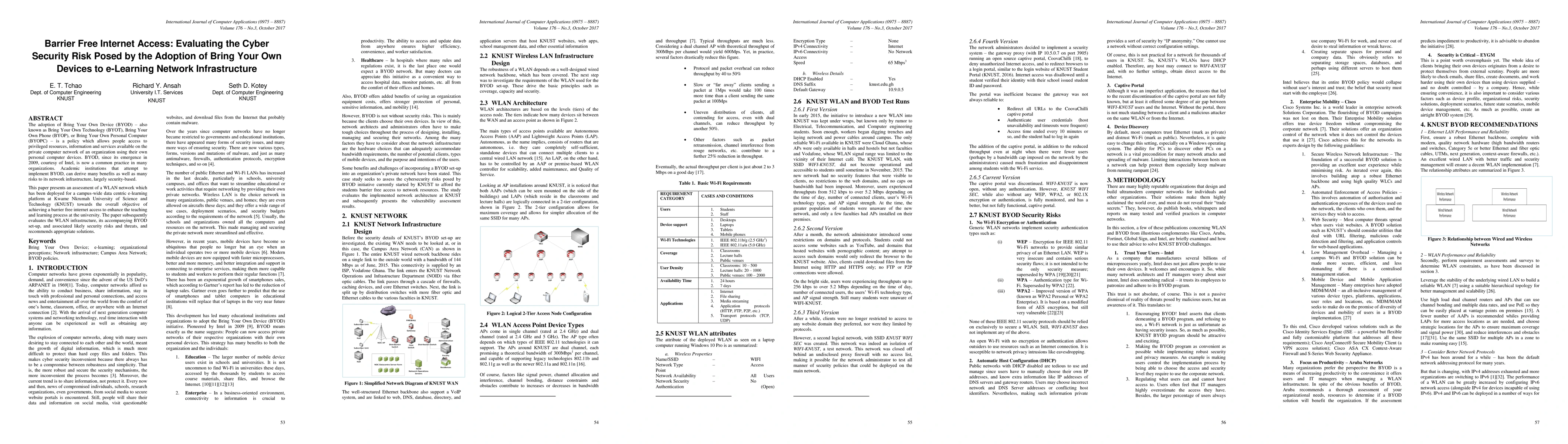 This paper assesses the WLAN network deployed for e-learning at KNUST, evaluating the security risks posed by the BYOD policy to the institution's network infrastructure, and recommends solutions to mitigate these risks. The study highlights the benefits of BYOD while emphasizing the associated cybersecurity challenges.