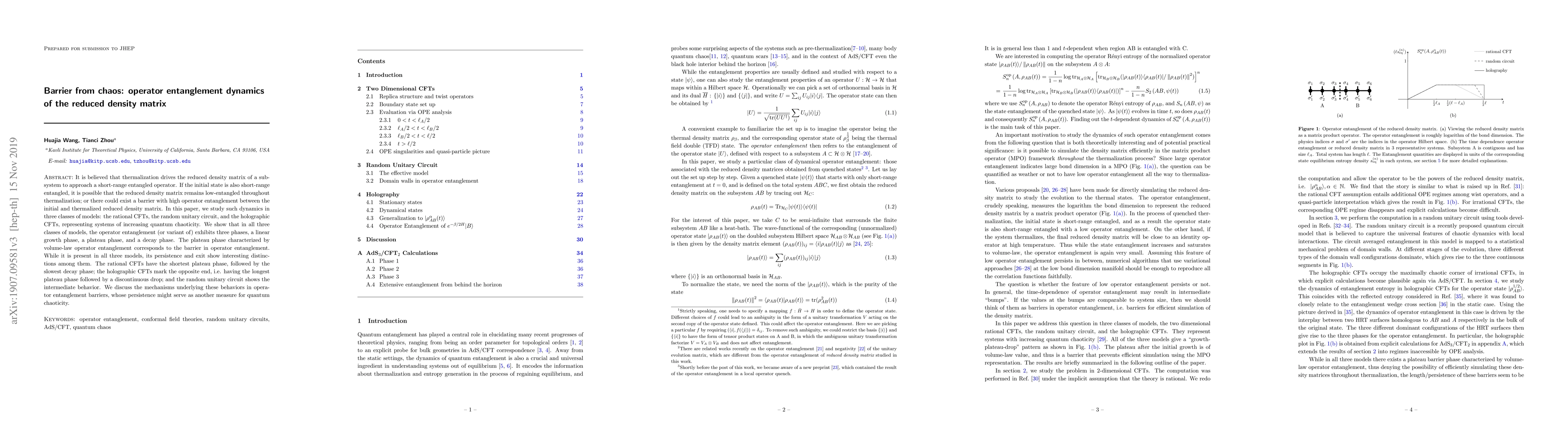 This paper investigates the dynamics of operator entanglement in reduced density matrices across three classes of quantum models—rational CFTs, random unitary circuits, and holographic CFTs—showing that operator entanglement exhibits three phases: linear growth, plateau, and decay. The plateau phase signifies a barrier in operator entanglement, with distinct persistence and decay behaviors observed among the models.