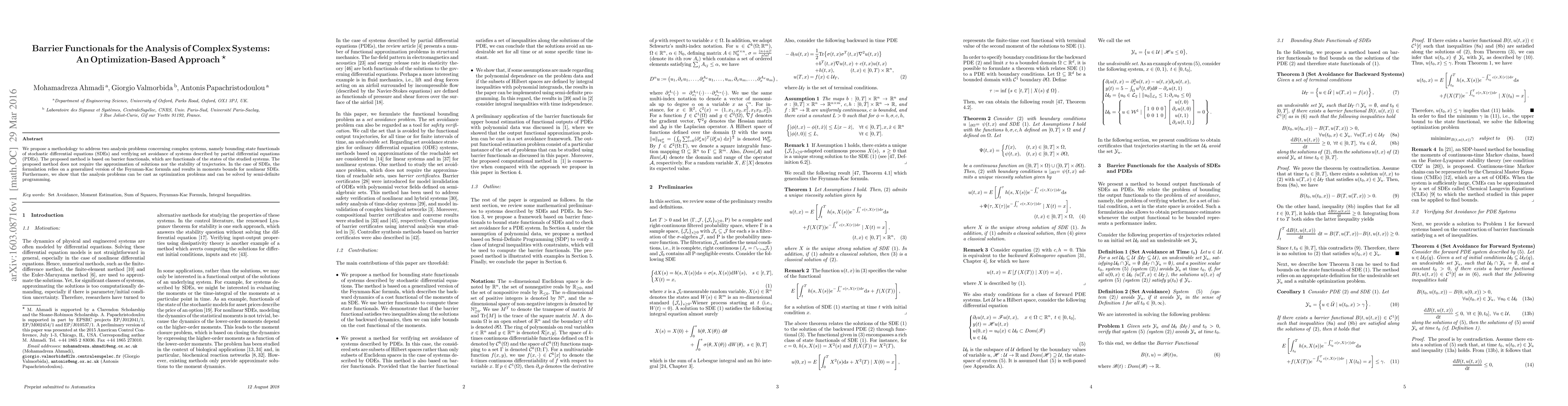 We propose a methodology to address two analysis problems concerning complex systems, namely bounding state functionals of stochastic differential equations (SDEs) and verifying set avoidance of systems described by partial differential equations (PDEs). The proposed method is based on barrier functionals, which are functionals of the states of the studied systems. The proposed method does not require the approximation of solutions nor the stability of trajectories. In the case of SDEs, the formulation relies on a generalized version of the Feynman-Kac formula and results in moments bounds for nonlinear SDEs. Furthermore, we show that the analysis problems can be cast as optimization problems and can be solved by semi-definite programming.