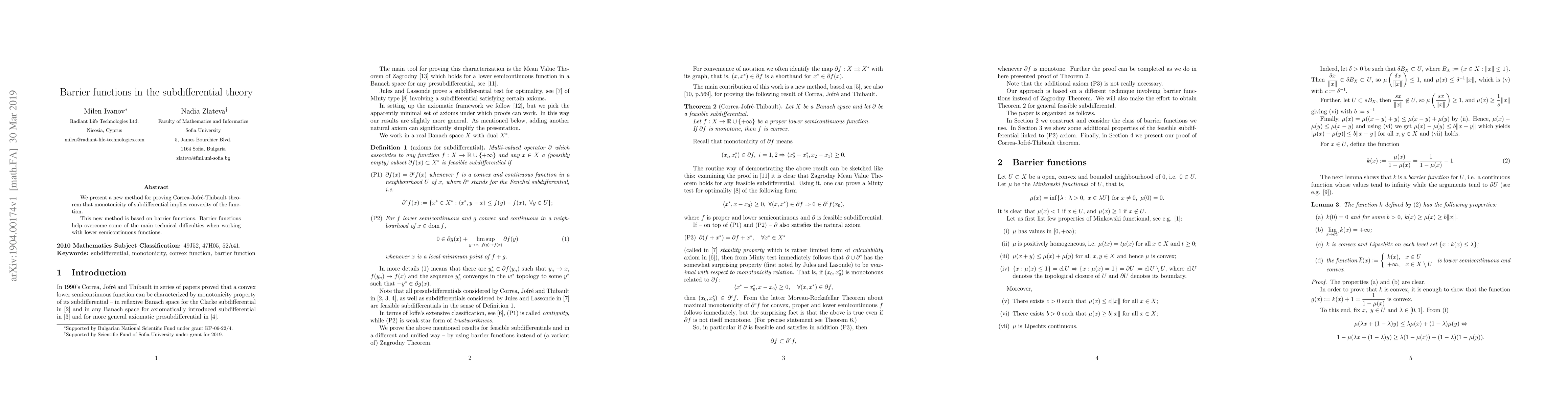 We present a new method for proving Correa-Jofr\'e-Thibault theorem that monotonicity of subdifferential implies convexity of the function. This new method is based on barrier functions. Barrier functions help overcome some of the main technical difficulties when working with lower semicontinuous functions.