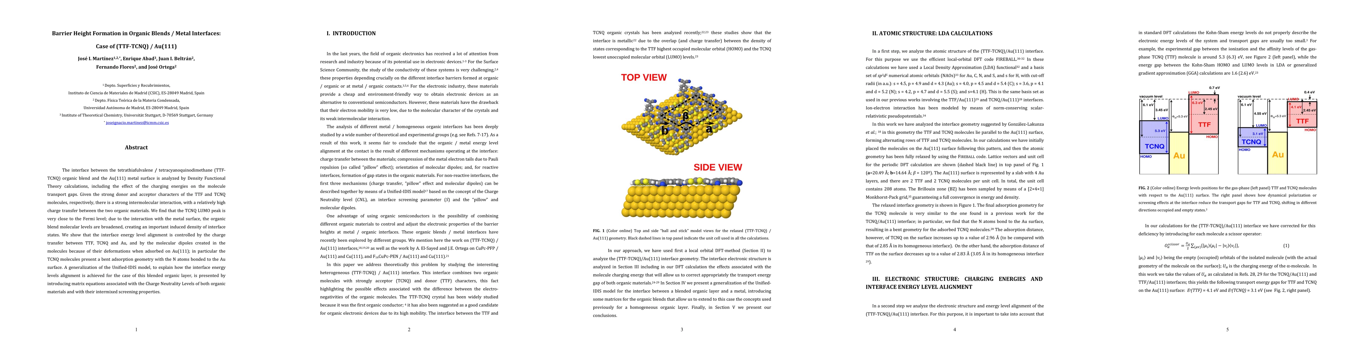 This study uses Density Functional Theory to analyze the interface between the organic blend TTF-TCNQ and Au(111), revealing significant charge transfer and induced interface states due to strong intermolecular interactions. The research proposes a generalized Unified-IDIS model to explain the alignment of energy levels at the interface, emphasizing the role of molecular dipoles and adsorption geometry.