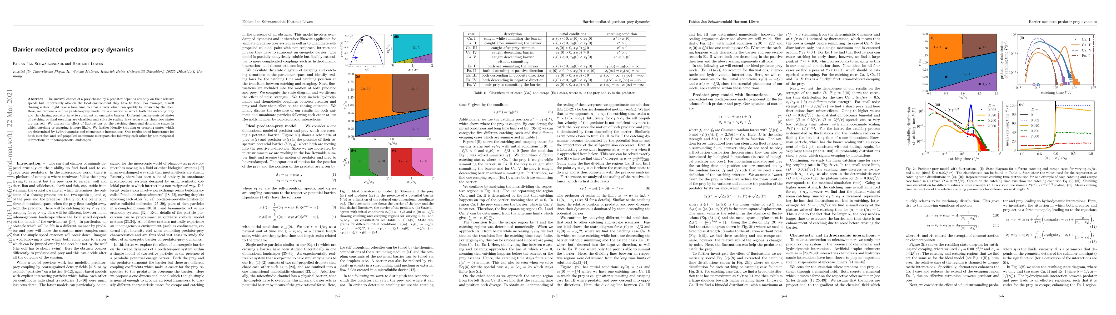 This paper proposes a predator-prey model where both predator and prey must overcome an energetic barrier, classifying different states of catching or escaping and deriving relevant scaling laws. The study also examines the impact of fluctuations on catching times and identifies states influenced by hydrodynamics and chemotactic interactions.