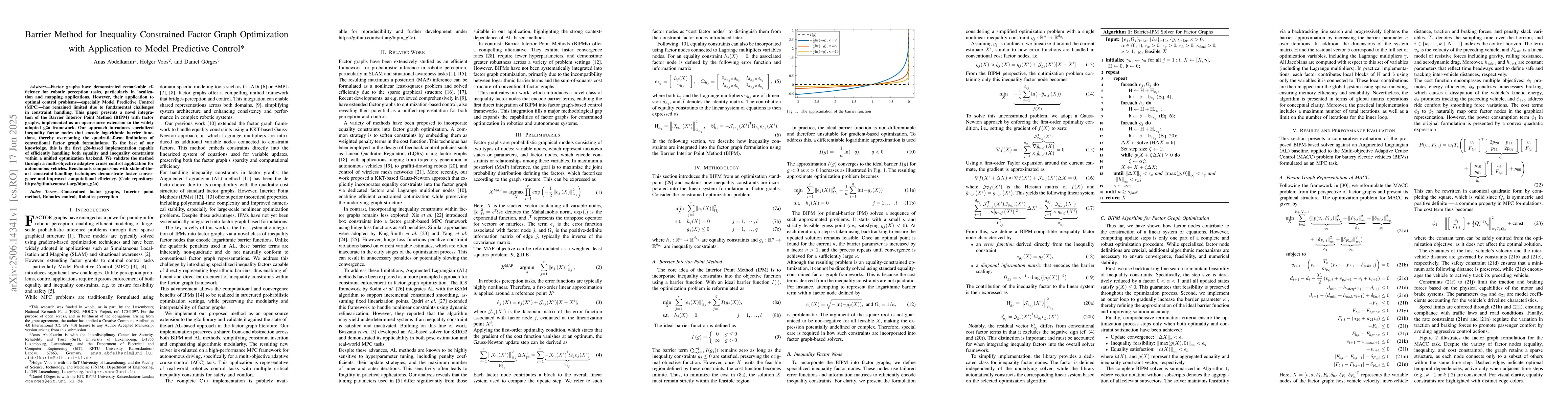 Factor graphs have demonstrated remarkable efficiency for robotic perception tasks, particularly in localization and mapping applications. However, their application to optimal control problems -- especially Model Predictive Control (MPC) -- has remained limited due to fundamental challenges in constraint handling. This paper presents a novel integration of the Barrier Interior Point Method (BIPM) with factor graphs, implemented as an open-source extension to the widely adopted g2o framework. Our approach introduces specialized inequality factor nodes that encode logarithmic barrier functions, thereby overcoming the quadratic-form limitations of conventional factor graph formulations. To the best of our knowledge, this is the first g2o-based implementation capable of efficiently handling both equality and inequality constraints within a unified optimization backend. We validate the method through a multi-objective adaptive cruise control application for autonomous vehicles. Benchmark comparisons with state-of-the-art constraint-handling techniques demonstrate faster convergence and improved computational efficiency. (Code repository: https://github.com/snt-arg/bipm_g2o)