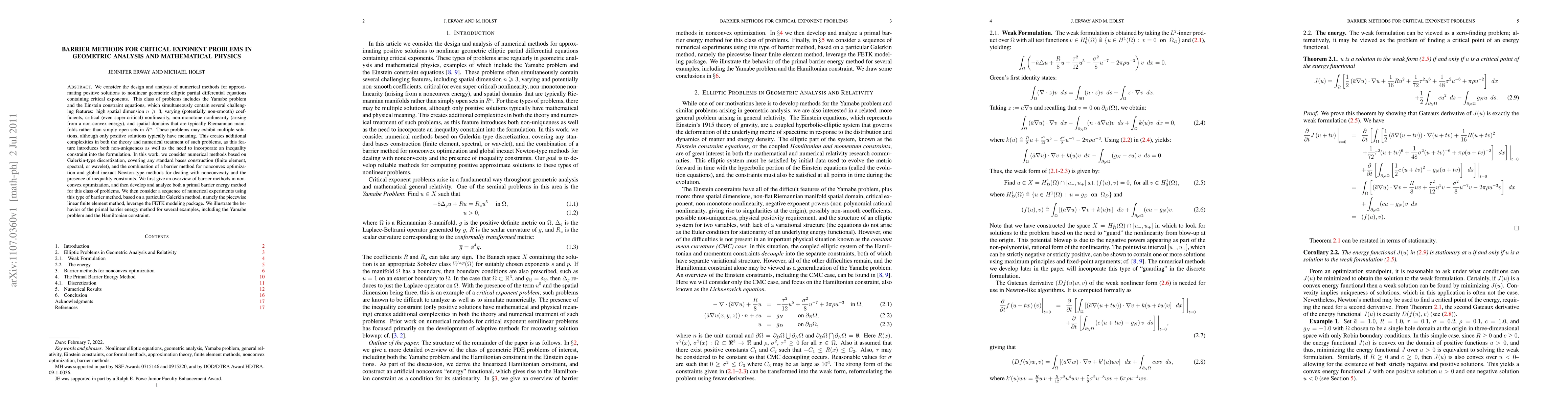 We consider the design and analysis of numerical methods for approximating positive solutions to nonlinear geometric elliptic partial differential equations containing critical exponents. This class of problems includes the Yamabe problem and the Einstein constraint equations, which simultaneously contain several challenging features: high spatial dimension n >= 3, varying (potentially non-smooth) coefficients, critical (even super-critical) nonlinearity, non-monotone nonlinearity (arising from a non-convex energy), and spatial domains that are typically Riemannian manifolds rather than simply open sets in Rn. These problems may exhibit multiple solutions, although only positive solutions typically have meaning. This creates additional complexities in both the theory and numerical treatment of such problems, as this feature introduces both non-uniqueness as well as the need to incorporate an inequality constraint into the formulation. In this work, we consider numerical methods based on Galerkin-type discretization, covering any standard bases construction (finite element, spectral, or wavelet), and the combination of a barrier method for nonconvex optimization and global inexact Newton-type methods for dealing with nonconvexity and the presence of inequality constraints. We first give an overview of barrier methods in non-convex optimization, and then develop and analyze both a primal barrier energy method for this class of problems. We then consider a sequence of numerical experiments using this type of barrier method, based on a particular Galerkin method, namely the piecewise linear finite element method, leverage the FETK modeling package. We illustrate the behavior of the primal barrier energy method for several examples, including the Yamabe problem and the Hamiltonian constraint.