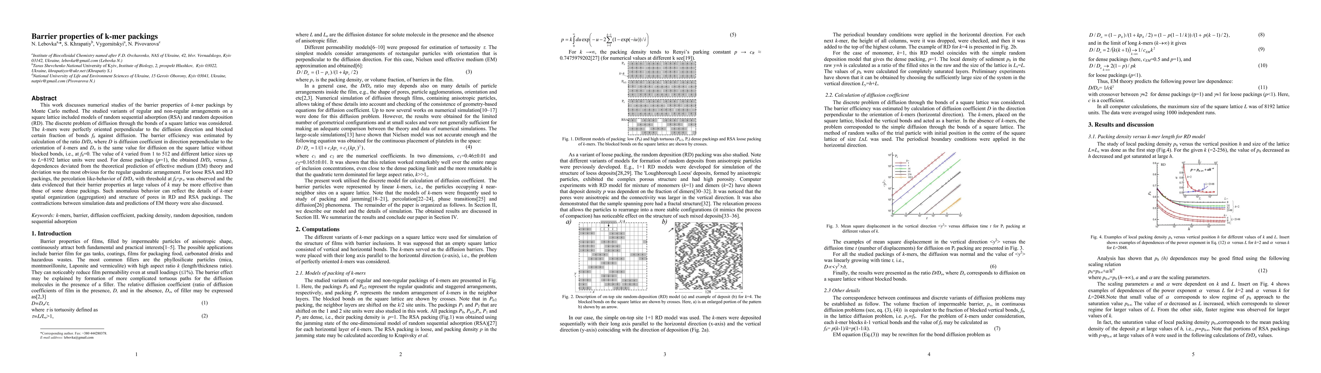 This work discusses numerical studies of the barrier properties of k-mer packings by Monte Carlo method. The studied variants of regular and non-regular arrangements on a square lattice included models of random sequential adsorption (RSA) and random deposition (RD). The discrete problem of diffusion through the bonds of a square lattice was considered. The k-mers were perfectly oriented perpendicular to the diffusion direction and blocked certain fraction of bonds $f_b$ against diffusion. For loose RSA and RD packings, the percolation like-behavior of diffusion coefficient was observed and the data evidenced that their barrier properties at large values of k may be more effective than those of some dense packings. Such anomalous behavior can reflect the details of k-mer spatial organization (aggregation) and structure of pores in RD and RSA packings. The contradictions between simulation data and predictions of EM theory were also discussed.