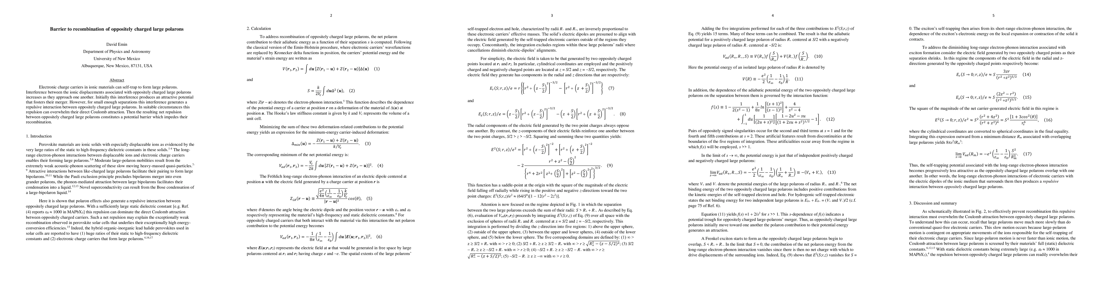 Electronic charge carriers in ionic materials can self-trap to form large polarons. Interference between the ionic displacements associated with oppositely charged large polarons increases as they approach one another. Initially this interference produces an attractive potential that fosters their merger. However, for small enough separations this interference generates a repulsive interaction between oppositely charged large polarons. In suitable circumstances this repulsion can overwhelm their direct Coulomb attraction. Then the resulting net repulsion between oppositely charged large polarons constitutes a potential barrier which impedes their recombination.