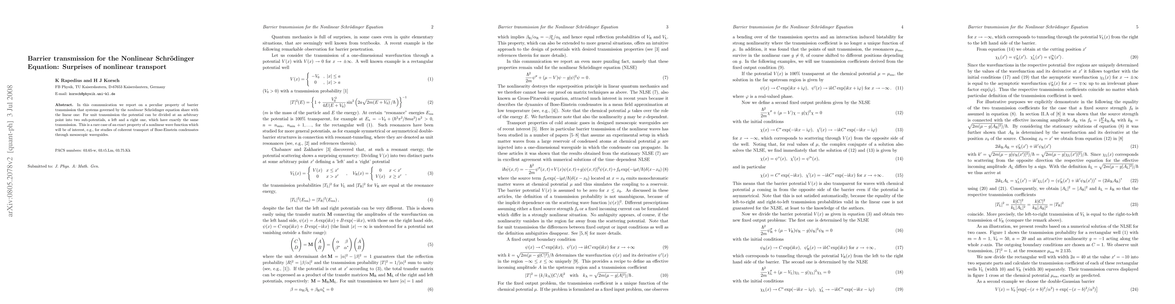 In this communication we report on a peculiar property of barrier transmission that systems governed by the nonlinear Schroedinger equation share with the linear one: For unit transmission the potential can be divided at an arbitrary point into two sub-potentials, a left and a right one, which have exactly the same transmission. This is a rare case of an exact property of a nonlinear wave function which will be of interest, e.g., for studies of coherent transport of Bose-Einstein condensates through mesoscopic waveguide