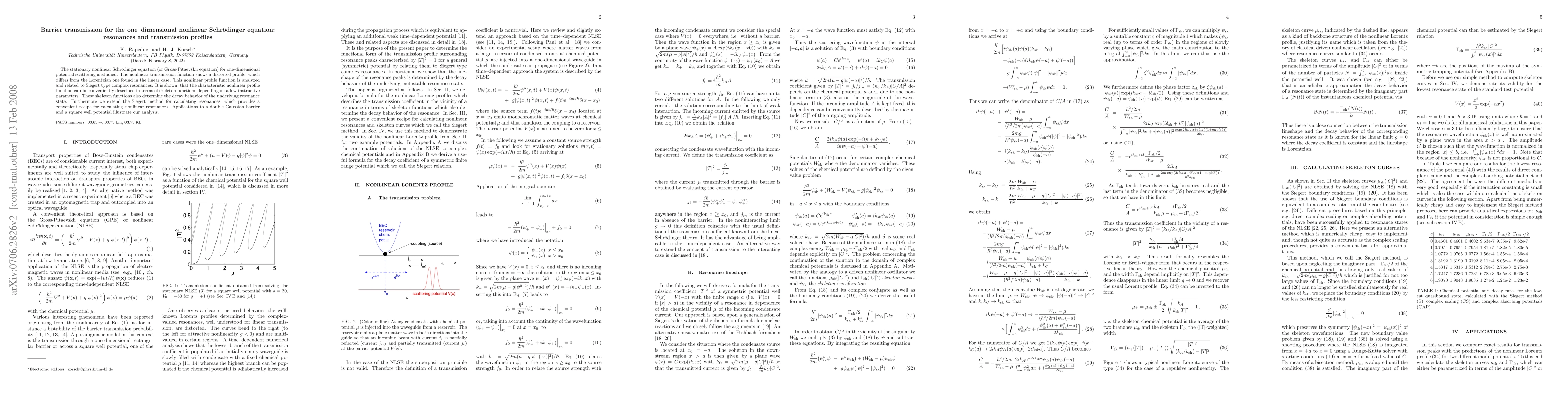 The stationary nonlinear Schr\"odinger equation (or Gross-Pitaevskii equation) for one-dimensional potential scattering is studied. The nonlinear transmission function shows a distorted profile, which differs from the Lorentzian one found in the linear case. This nonlinear profile function is analyzed and related to Siegert type complex resonances. It is shown, that the characteristic nonlinear profile function can be conveniently described in terms of skeleton functions depending on a few instructive parameters. These skeleton functions also determine the decay behavior of the underlying resonance state. Furthermore we extend the Siegert method for calculating resonances, which provides a convenient recipe for calculating nonlinear resonances. Applications to a double Gaussian barrier and a square well potential illustrate our analysis.