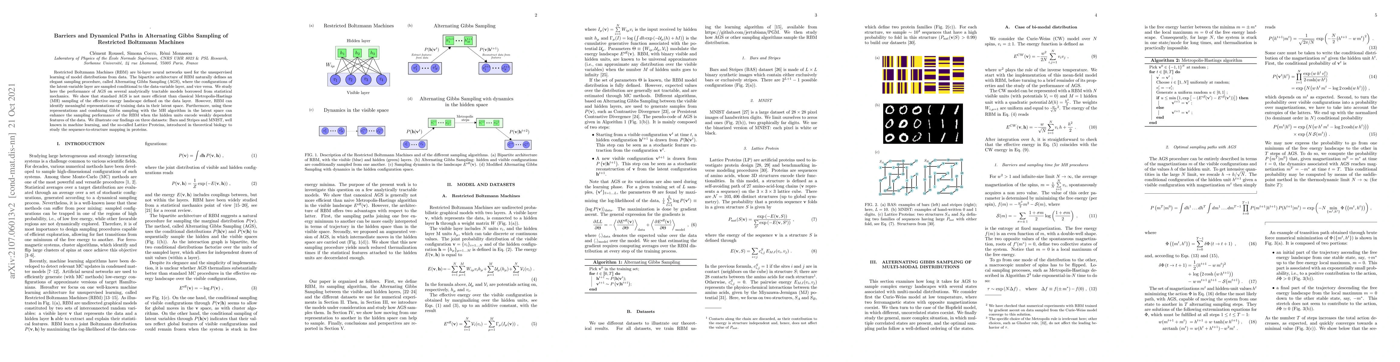 Restricted Boltzmann Machines (RBM) are bi-layer neural networks used for the unsupervised learning of model distributions from data. The bipartite architecture of RBM naturally defines an elegant sampling procedure, called Alternating Gibbs Sampling (AGS), where the configurations of the latent-variable layer are sampled conditional to the data-variable layer, and vice versa. We study here the performance of AGS on several analytically tractable models borrowed from statistical mechanics. We show that standard AGS is not more efficient than classical Metropolis-Hastings (MH) sampling of the effective energy landscape defined on the data layer. However, RBM can identify meaningful representations of training data in their latent space. Furthermore, using these representations and combining Gibbs sampling with the MH algorithm in the latent space can enhance the sampling performance of the RBM when the hidden units encode weakly dependent features of the data. We illustrate our findings on three datasets: Bars and Stripes and MNIST, well known in machine learning, and the so-called Lattice Proteins, introduced in theoretical biology to study the sequence-to-structure mapping in proteins.