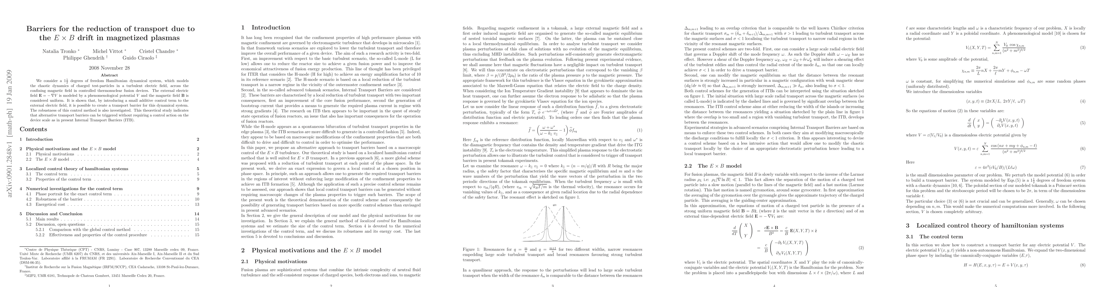 We consider a 1 1/2degrees of freedom Hamiltonian dynamical system, which models the chaotic dynamics of charged test-particles in a turbulent electric field, across the confining magnetic field in controlled thermonuclear fusion devices. The external electric field E = \nabla\bigvee is modeled by a phenomenological potential V and the magnetic field B is considered uniform. It is shown that, by introducing a small additive control term to the external electric field, it is possible to create a transport barrier for this dynamical system. The robustness of this control method is also investigated. This theoretical study indicates that alternative transport barriers can be triggered without requiring a control action on the device scale as in present Internal Transport Barriers (ITB).