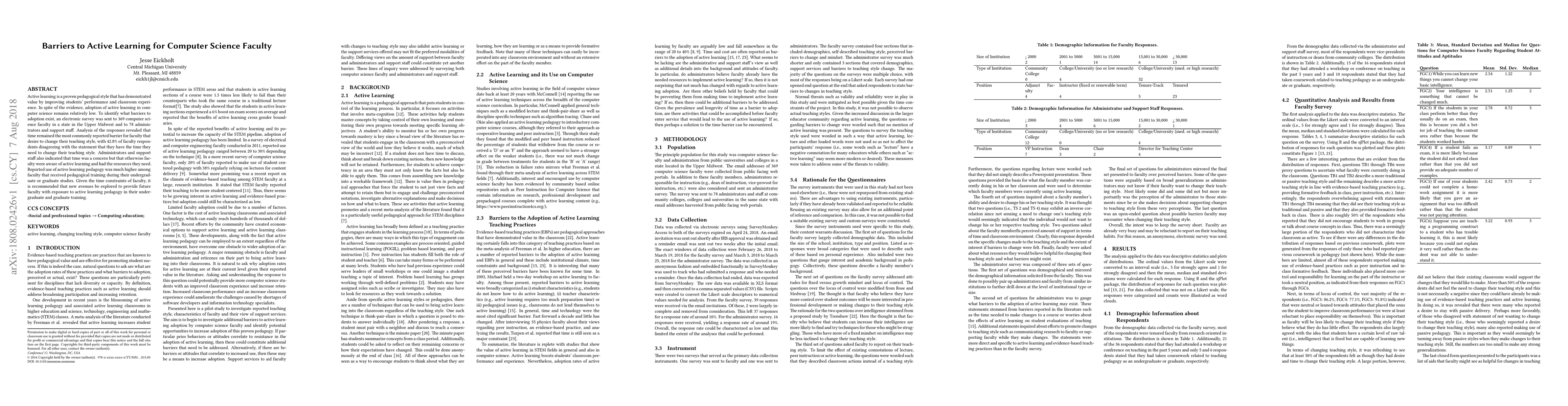 The study identifies time as the primary barrier for computer science faculty adopting active learning, with 42.8% of respondents feeling they lack sufficient time. Faculty who received pedagogical training during their studies reported higher use of active learning methods, suggesting the need for integrating active learning exposure in faculty training programs.
