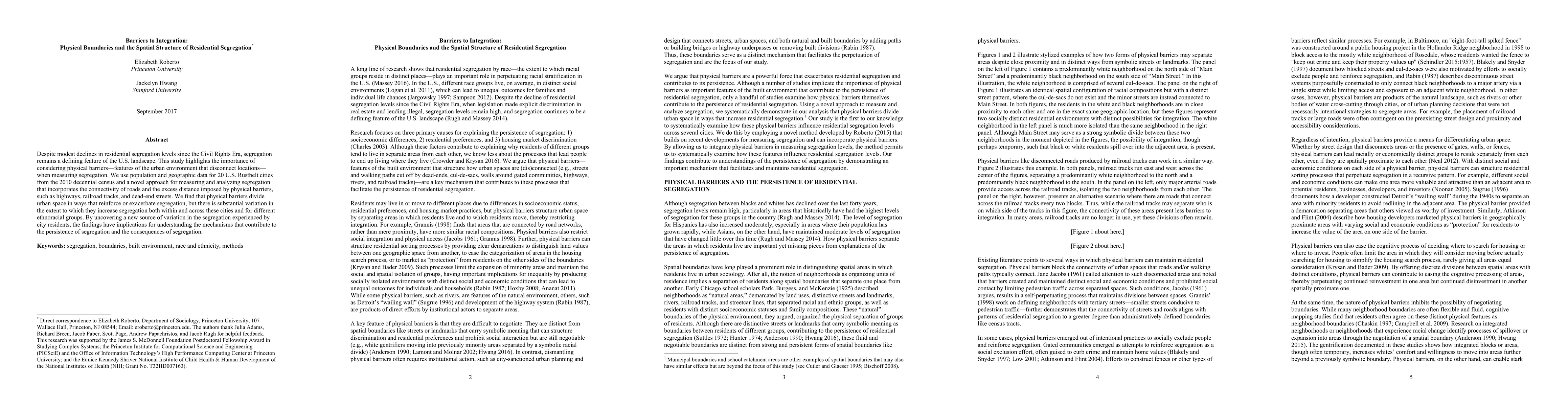 This study examines how physical barriers in urban environments, such as highways and railroad tracks, contribute to residential segregation in 20 Rustbelt cities. It finds that these barriers exacerbate segregation, though the extent varies significantly across cities and for different ethnoracial groups.