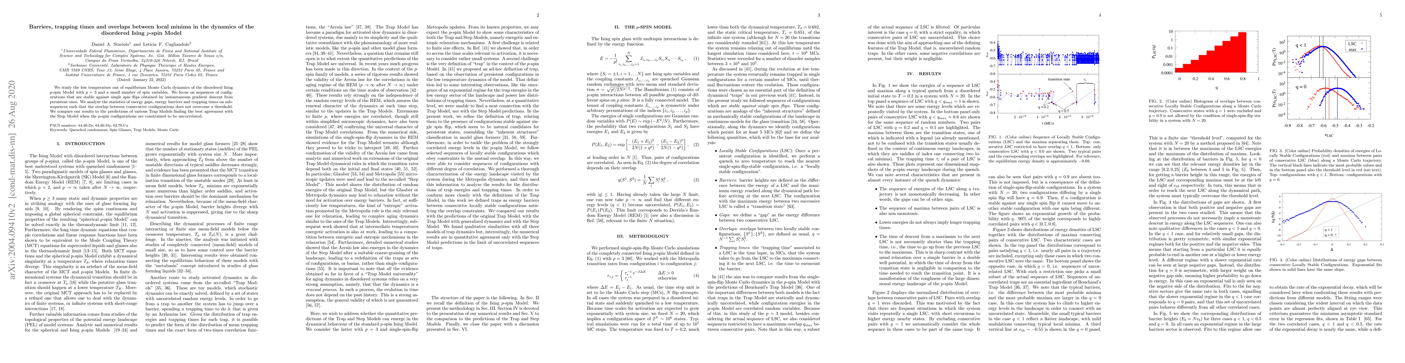 We study the low temperature out of equilibrium Monte Carlo dynamics of the disordered Ising $p$-spin Model with $p=3$ and a small number of spin variables. We focus on sequences of configurations that are stable against single spin flips obtained by instantaneous gradient descent from persistent ones. We analyze the statistics of energy gaps, energy barriers and trapping times on sub-sequences such that the overlap between consecutive configurations does not overcome a threshold. We compare our results to the predictions of various trap models finding the best agreement with the step model when the $p$-spin configurations are constrained to be uncorrelated.