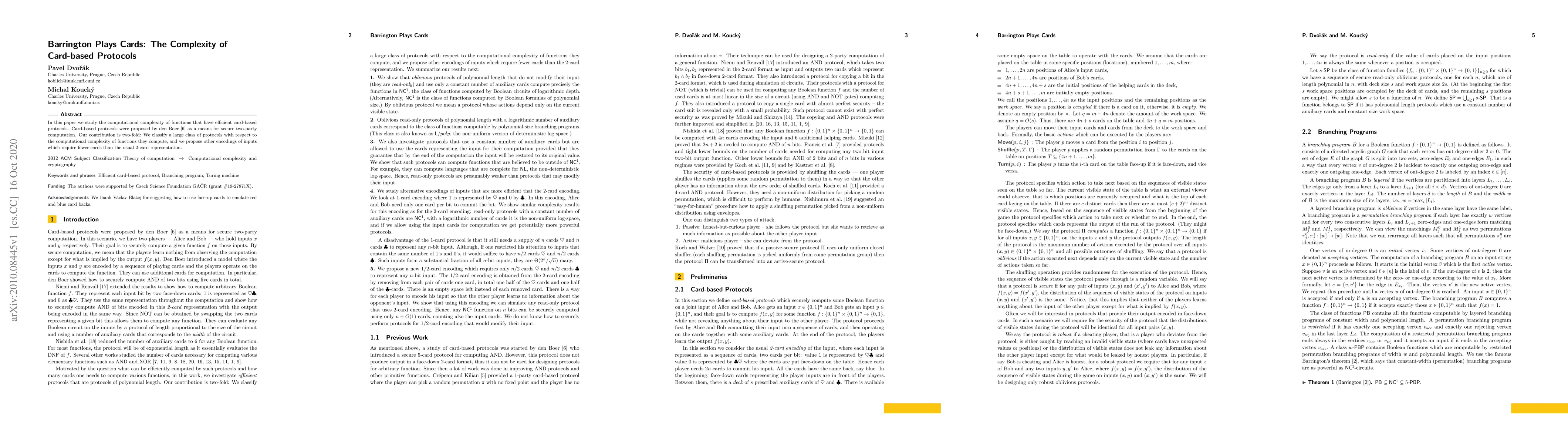In this paper we study the computational complexity of functions that have efficient card-based protocols. Card-based protocols were proposed by den Boer [EUROCRYPT '89] as a means for secure two-party computation. Our contribution is two-fold: We classify a large class of protocols with respect to the computational complexity of functions they compute, and we propose other encodings of inputs which require fewer cards than the usual 2-card representation.