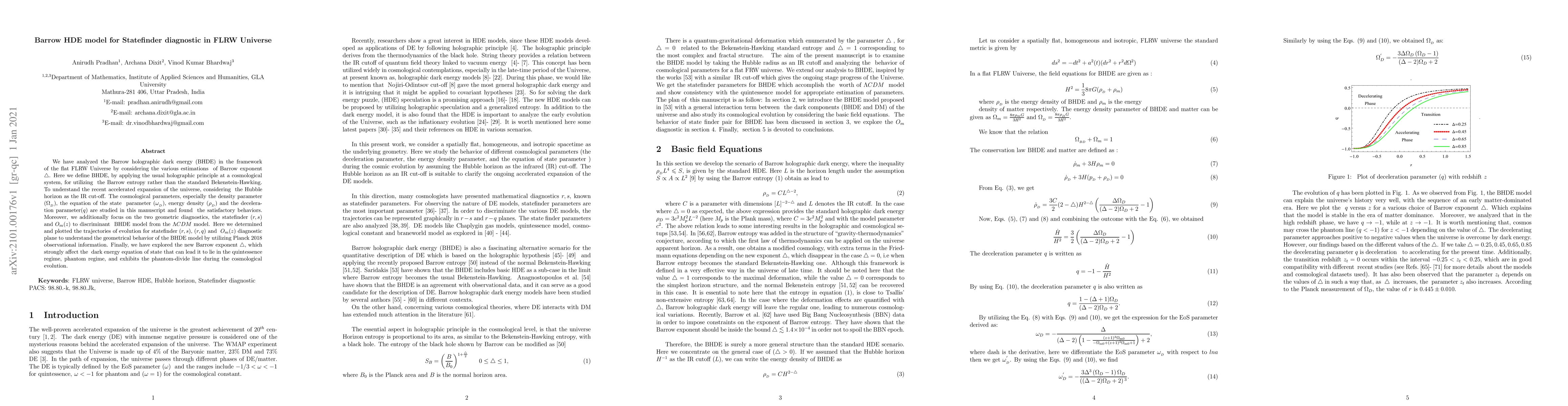 We have analyzed the Barrow holographic dark energy (BHDE) in the framework of the flat FLRW Universe by considering the various estimations of Barrow exponent $\triangle$. Here we define BHDE, by applying the usual holographic principle at a cosmological system, for utilizing the Barrow entropy rather than the standard Bekenstein-Hawking. To understand the recent accelerated expansion of the universe, considering the Hubble horizon as the IR cut-off. The cosmological parameters, especially the density parameter ($\Omega_{_D}$), the equation of the state parameter ($\omega_{_D}$), energy density ($\rho_{_{D}}$) and the deceleration parameter($q$) are studied in this manuscript and found the satisfactory behaviors. Moreover, we additionally focus on the two geometric diagnostics, the statefinder $(r,s)$ and $O_{m}(z)$ to discriminant BHDE model from the $\Lambda CDM$ model. Here we determined and plotted the trajectories of evolution for statefinder $(r, s)$, $(r,q)$ and $O_{m}(z)$ diagnostic plane to understand the geometrical behavior of the BHDE model by utilizing Planck 2018 observational information. Finally, we have explored the new Barrow exponent $\triangle$, which strongly affects the dark energy equation of state that can lead it to lie in the quintessence regime, phantom regime, and exhibits the phantom-divide line during the cosmological evolution.