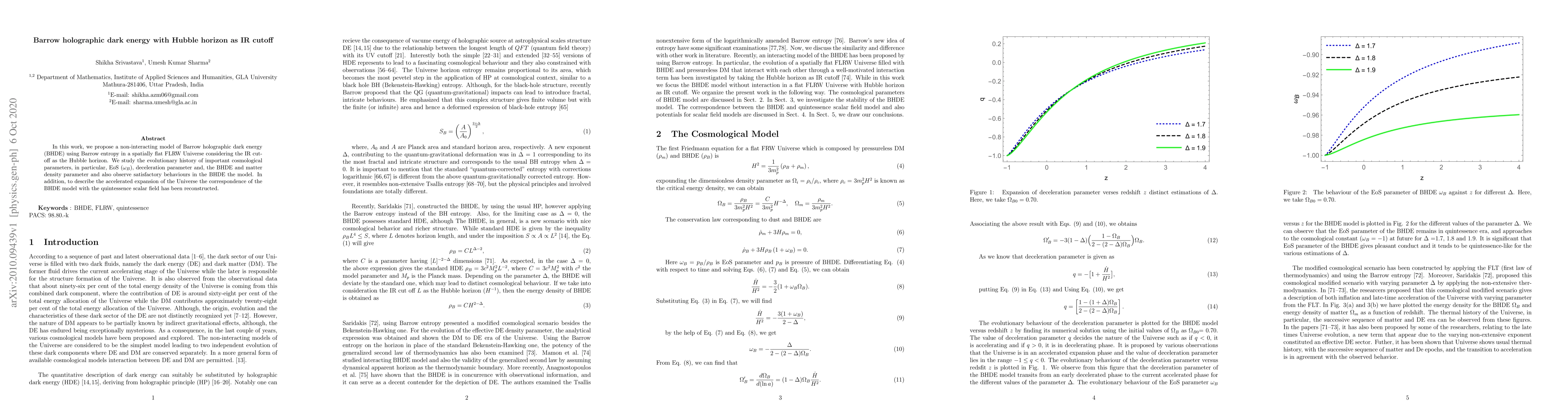 This paper proposes a model of Barrow holographic dark energy (BHDE) using Barrow entropy in a flat FLRW Universe, with the Hubble horizon as the infrared cutoff. It examines the evolution of cosmological parameters, including the equation of state, and finds satisfactory behavior in the model, also linking it to quintessence scalar fields to describe the accelerated expansion of the Universe.