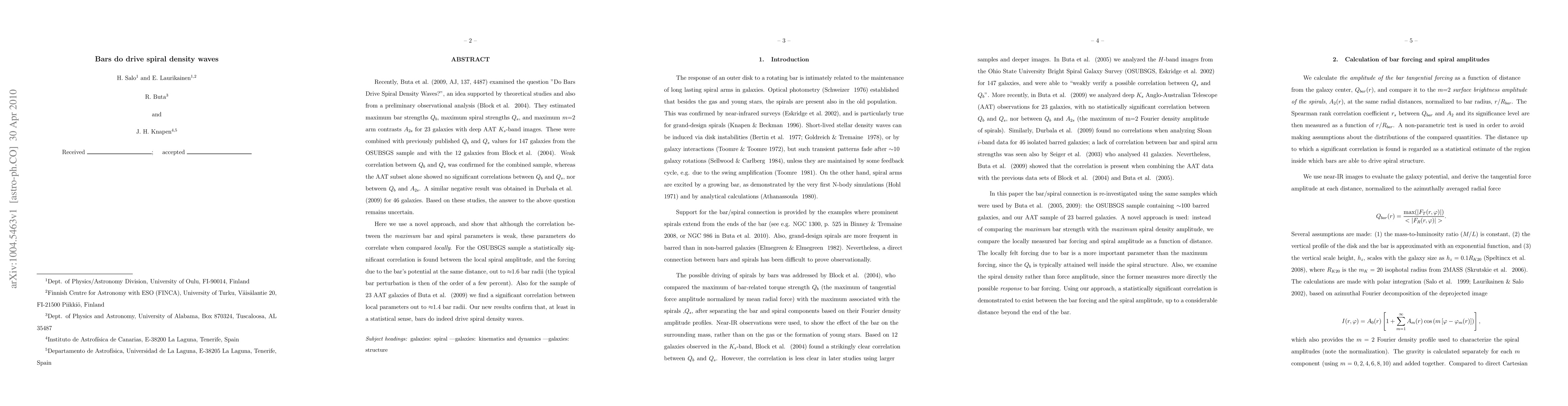 Recently, Buta etal. (2009) examined the question "Do Bars Drive Spiral Density Waves?", an idea supported by theoretical studies and also from a preliminary observational analysis Block etal (2004). They estimated maximum bar strengths Q_b, maximum spiral strengths Q_s, and maximum m=2 arm contrasts A_2s for 23 galaxies with deep AAT K_s-band images. These were combined with previously published Q_b and Q_s values for 147 galaxies from the OSUBSGS sample and with the 12 galaxies from Block etal(2004). Weak correlation between Q_b and Q_s was confirmed for the combined sample, whereas the AAT subset alone showed no significant correlations between Q_b and Q_s, nor between Q_b and A_2s. A similar negative result was obtained in Durbala etal. (2009) for 46 galaxies. Based on these studies, the answer to the above question remains uncertain. Here we use a novel approach, and show that although the correlation between the maximum bar and spiral parameters is weak, these parameters do correlate when compared locally. For the OSUBSGS sample a statistically significant correlation is found between the local spiral amplitude, and the forcing due to the bar's potential at the same distance, out to 1.6 bar radii (the typical bar perturbation is then of the order of a few percent). Also for the sample of 23 AAT galaxies we find a significant correlation between local parameters out to 1.4 bar radii. Our new results confirm that, at least in a statistical sense, bars do indeed drive spiral density waves.