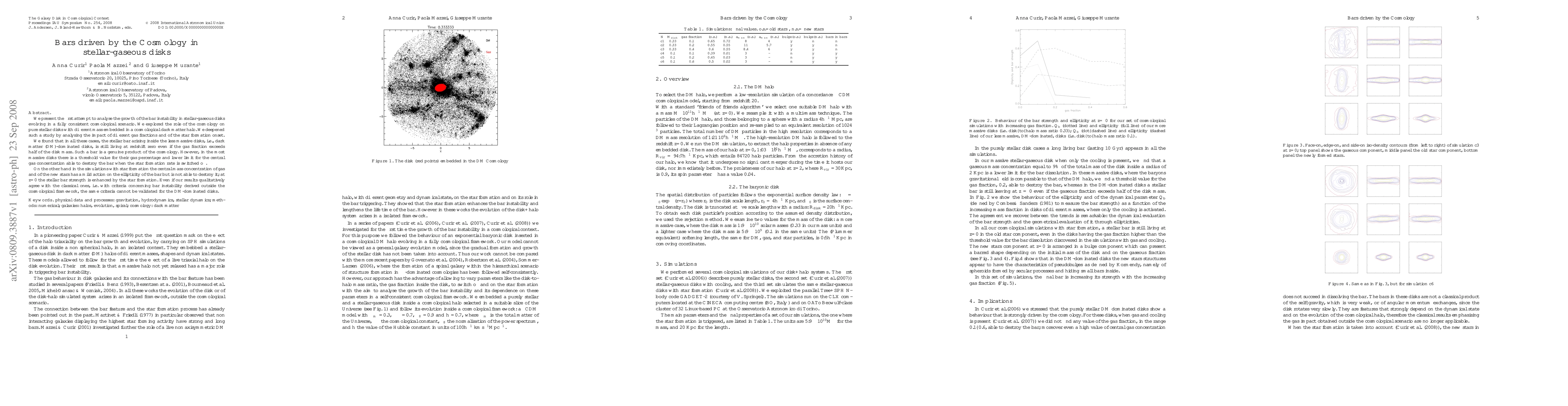 We present the first attempt to analyse the growth of the bar instability in stellar-gaseous disks evolving in a fully consistent cosmological scenario. We explored the role of the cosmology on pure stellar disks with different mass embedded in a cosmological dark matter halo. We deepened such a study by analysing the impact of different gas fractions and of the star formation onset. We found that in all these cases, the stellar bar arising inside the less massive disks, i.e., dark matter (DM)-dominated disks, is still living at redshift zero even if the gas fraction exceeds half of the disk mass. Such a bar is a genuine product of the cosmology. However, in the most massive disks there is a threshold value for their gas percentage and lower limit for the central gas concentration able to destroy the bar when the star formation rate is switched off. On the other hand in the simulations with star formation the central mass concentration of gas and of the new stars has a mild action on the ellipticity of the bar but is not able to destroy it; at z=0 the stellar bar strength is enhanced by the star formation. Even if our results qualitatively agree with the classical ones, i.e. with criteria concerning bar instability derived outside the cosmological framework, the same criteria cannot be validated for the DM-dominated disks.