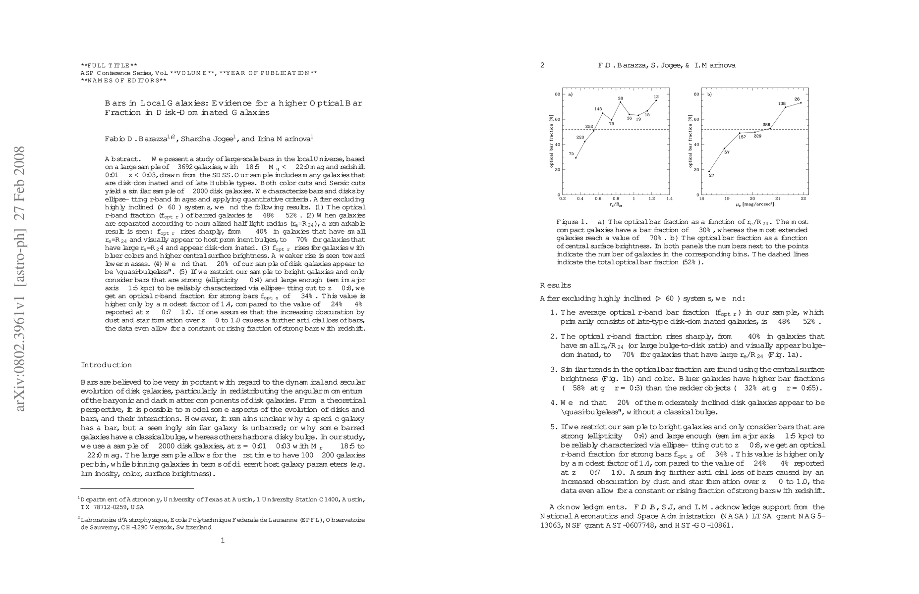 A study of 3692 galaxies found that disk-dominated galaxies have a higher optical bar fraction, ranging from 40% to 70%, with the highest fraction seen in galaxies with large half-light radii and blue colors.