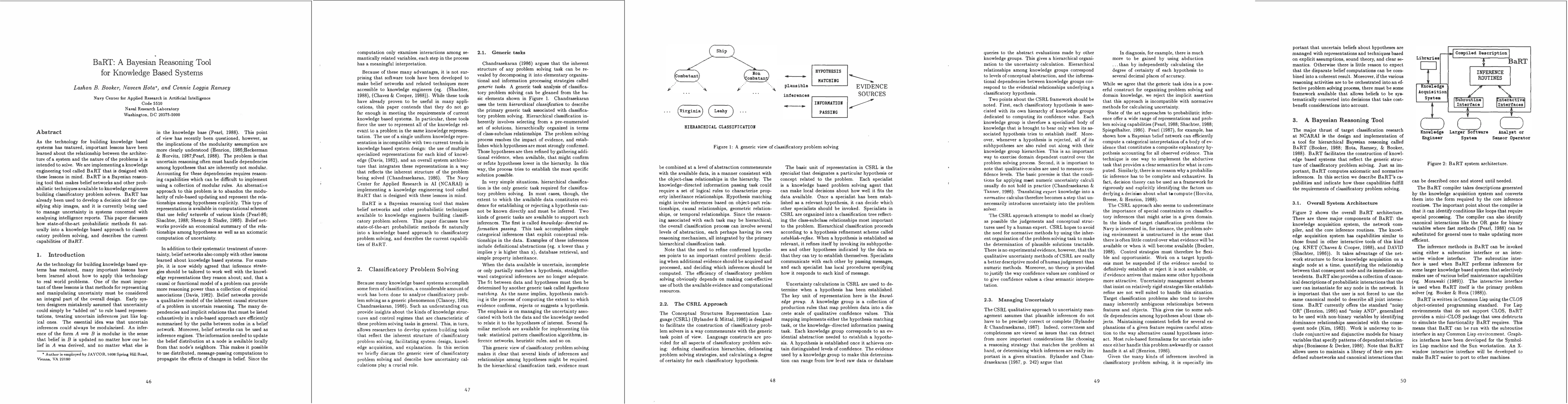 BART is a Bayesian reasoning tool that employs belief networks and probabilistic techniques for knowledge engineers in developing classificatory problem solvers. It has been used for ship image classification and intelligence report analysis, demonstrating its utility in managing uncertainty.