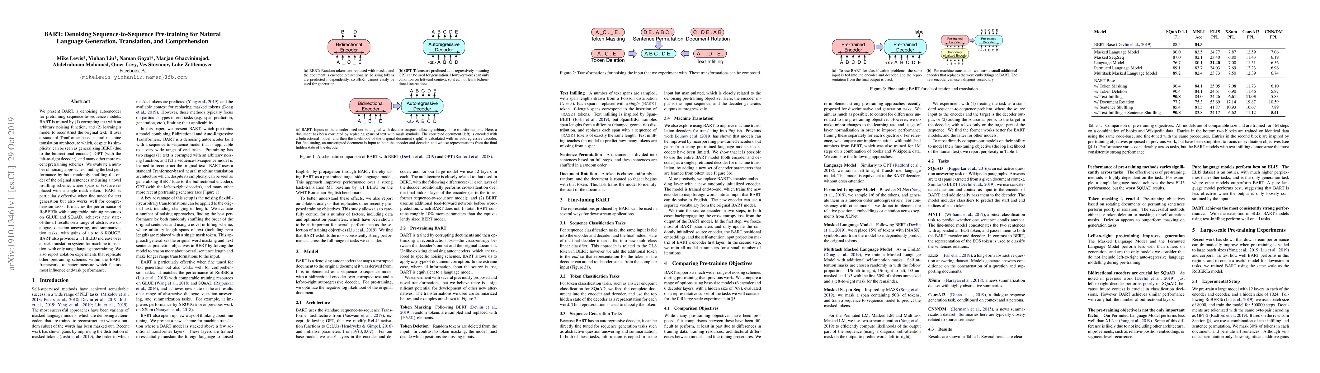 We present BART, a denoising autoencoder for pretraining sequence-to-sequence models. BART is trained by (1) corrupting text with an arbitrary noising function, and (2) learning a model to reconstruct the original text. It uses a standard Tranformer-based neural machine translation architecture which, despite its simplicity, can be seen as generalizing BERT (due to the bidirectional encoder), GPT (with the left-to-right decoder), and many other more recent pretraining schemes. We evaluate a number of noising approaches, finding the best performance by both randomly shuffling the order of the original sentences and using a novel in-filling scheme, where spans of text are replaced with a single mask token. BART is particularly effective when fine tuned for text generation but also works well for comprehension tasks. It matches the performance of RoBERTa with comparable training resources on GLUE and SQuAD, achieves new state-of-the-art results on a range of abstractive dialogue, question answering, and summarization tasks, with gains of up to 6 ROUGE. BART also provides a 1.1 BLEU increase over a back-translation system for machine translation, with only target language pretraining. We also report ablation experiments that replicate other pretraining schemes within the BART framework, to better measure which factors most influence end-task performance.