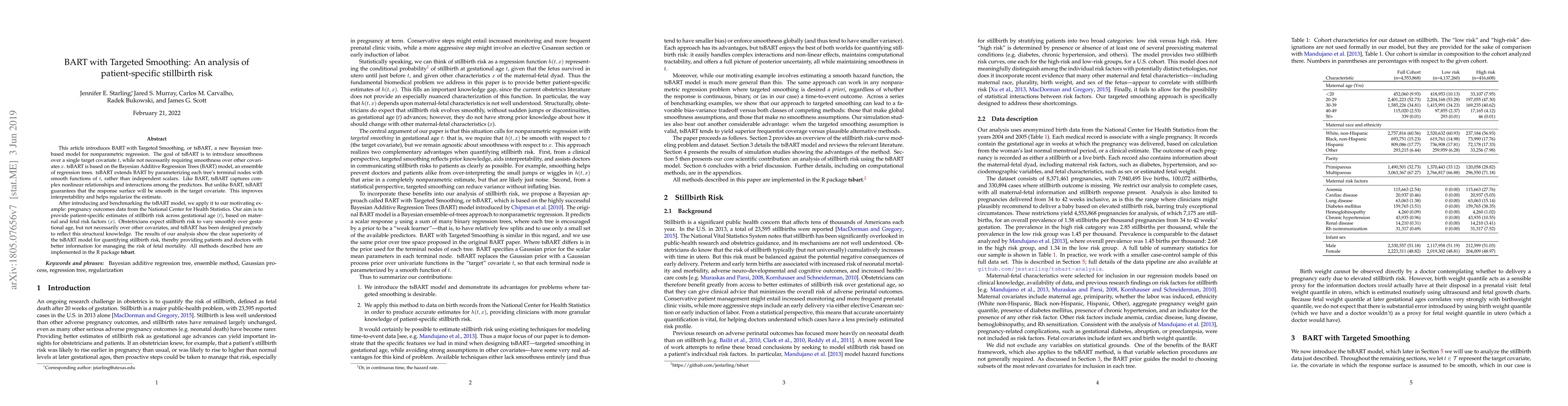 This paper introduces tsBART, a Bayesian tree-based model that smooths a single target covariate while allowing for complex interactions among other predictors, applied to estimate patient-specific stillbirth risk. The results show tsBART's superior performance over traditional BART in providing interpretable and regularized stillbirth risk estimates across gestational age.