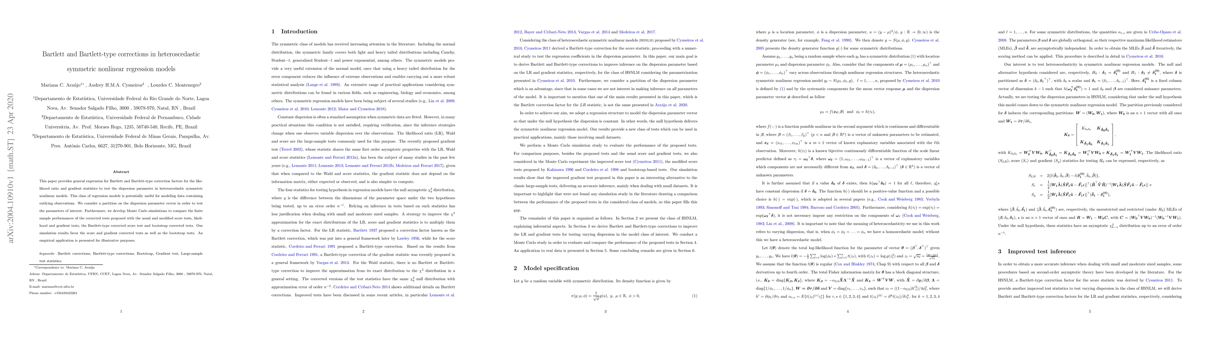 This paper provides general expression for Bartlett and Bartlett-type correction factors for the likelihood ratio and gradient statistics to test the dispersion parameter in heteroscedastic symmetric nonlinear models. This class of regression models is potentially useful for modeling data containing outlying observations. We consider a partition on the dispersion parameter vector in order to test the parameters of interest. Furthermore, we develop Monte Carlo simulations to compare the finite sample performances of the corrected tests proposed with the usual and modified score tests, likelihood and gradient tests, the Bartlett-type corrected score test and bootstrap corrected tests. Our simulation results favor the score and gradient corrected tests as well as the bootstrap tests. An empirical application is presented for illustrative purposes.