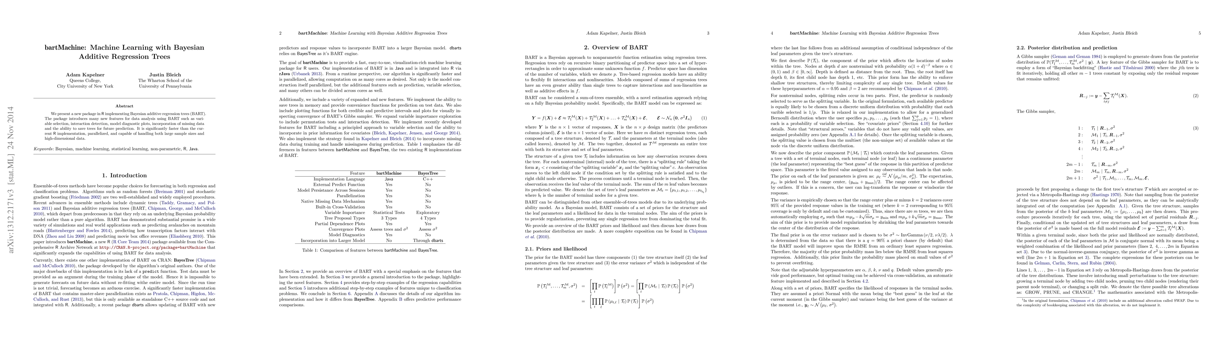 Summary: The bartMachine R package introduces Bayesian Additive Regression Trees (BART) with enhanced features for variable selection, interaction detection, and model diagnostics, offering improved speed and scalability for large datasets and high-dimensional data. It also supports missing data and parallel processing.
