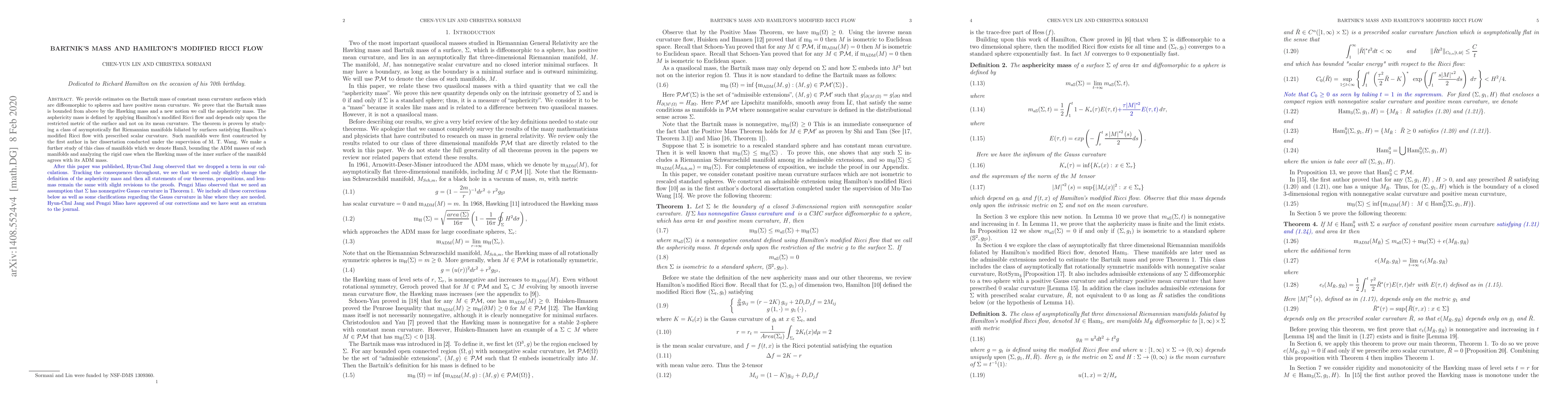 We provide estimates on the Bartnik mass of constant mean curvature (CMC) surfaces which are diffeomorphic to spheres and have positive mean curvature. We prove that the Bartnik mass is bounded from above by the Hawking mass and a new notion we call the asphericity mass. The asphericity mass is defined by applying Hamilton's modified Ricci flow and depends only upon the restricted metric of the surface and not on its mean curvature. The theorem is proven by studying a class of asymptotically flat Riemannian manifolds foliated by surfaces satisfying Hamilton's modified Ricci flow with prescribed scalar curvature. Such manifolds were first constructed by the first author in her dissertation conducted under the supervision of M.T. Wang. We make a further study of this class of manifolds bounding the ADM masses of such manifolds and analyzing the rigid case when the Hawking mass of the inner surface of the manifold agrees with its ADM mass. New in 2020: After this paper was published, Hyun-Chul Jang observed that we dropped a term in our calculations. Tracking the consequences throughout, we see that we need only slightly change the definition of the asphericity mass and then all statements of our theorems, propositions, and lemmas remain the same as the published version with slight revisions to the proofs. Pengzi Miao observed we needed an assumption on Gauss curvature in Theorem 1. We include these corrections and also some clarifications where they are needed in blue. Both Hyun-Chul Jang and Pengzi Miao have approved of our corrections and we have sent an erratum to the journal.