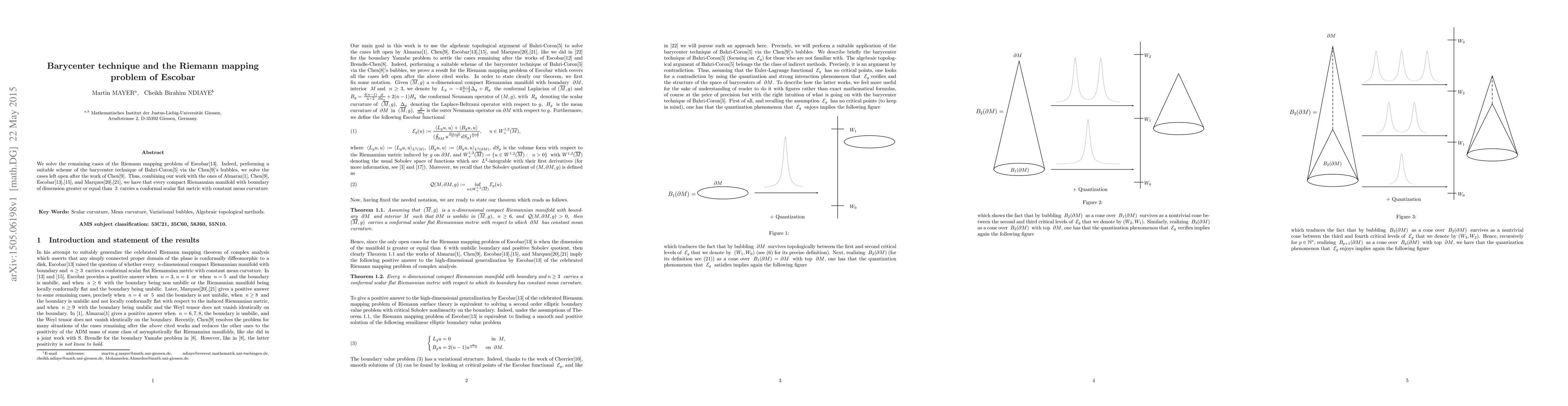 This paper resolves the remaining cases of Escobar's Riemann mapping problem using the barycenter technique and Chen's bubbles, completing the work of Chen and others. It concludes that every compact Riemannian manifold with boundary of dimension three or greater has a conformal scalar flat metric with constant mean curvature.