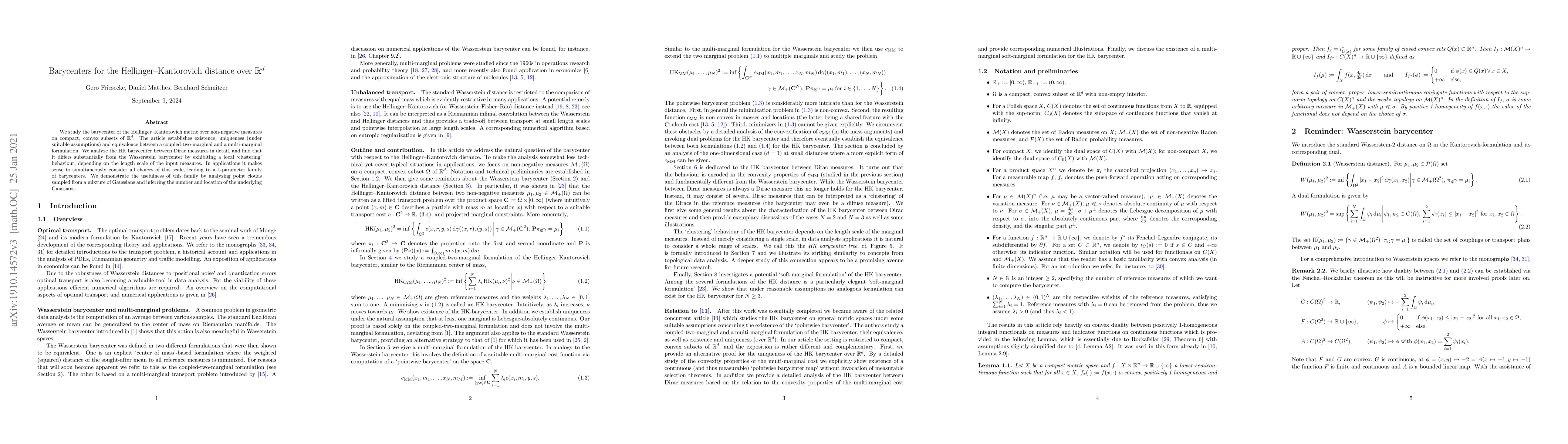 This paper investigates the existence and uniqueness of the barycenter for the Hellinger-Kantorovich (HK) distance over non-negative measures on compact, convex subsets of $\mathbb{R}^d$. It reveals a distinct "clustering" behavior of the HK barycenter compared to the Wasserstein barycenter, leading to a 1-parameter family of barycenters useful for analyzing point clouds from Gaussian mixtures.