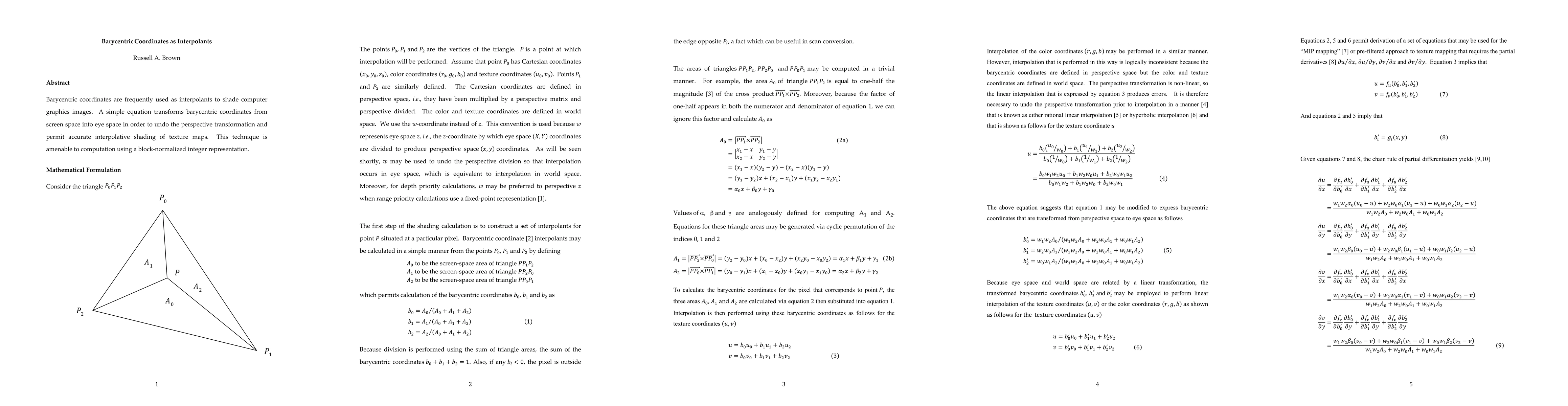 Summary: Barycentric coordinates are utilized for accurate texture map interpolation in computer graphics by transforming screen space to eye space, enabling precise shading; this method is efficiently computed using a block-normalized integer representation.