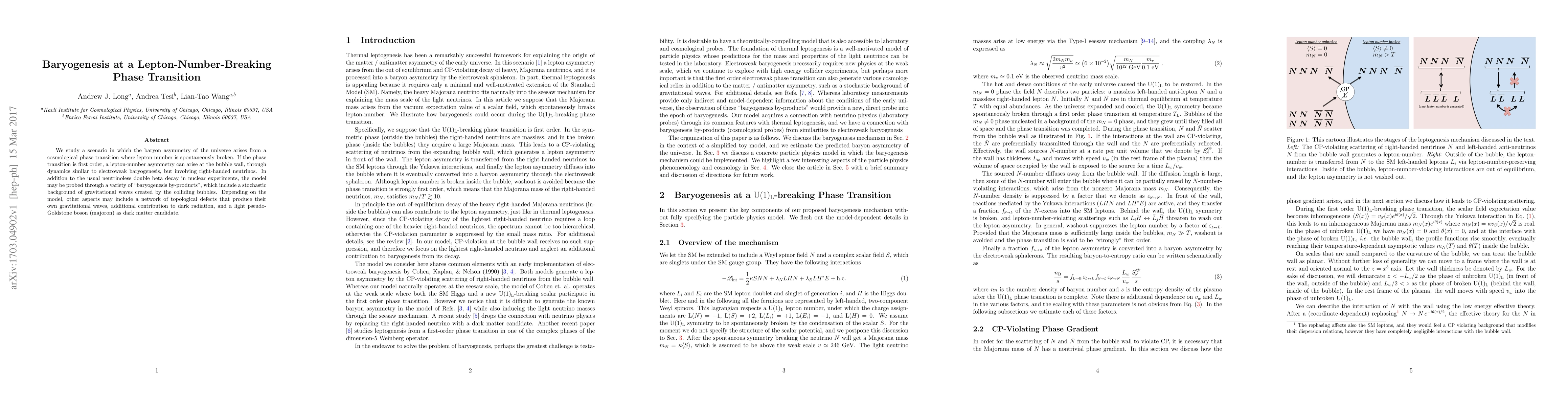 This paper explores a mechanism for generating the universe's baryon asymmetry through a first-order phase transition that breaks lepton number, potentially observable via gravitational waves and other "baryogenesis by-products," including a majoron as a dark matter candidate. The model also predicts neutrinoless double beta decay and topological defect networks.