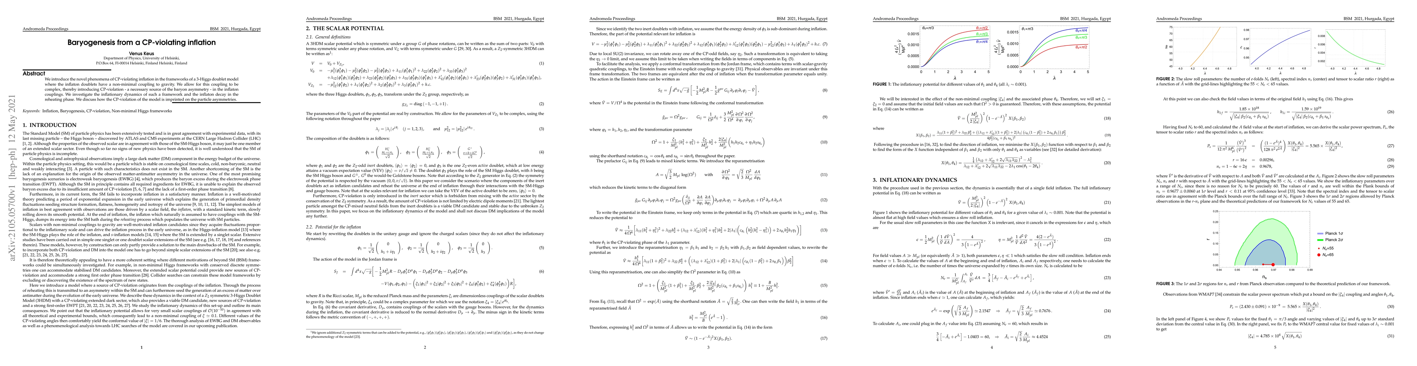 We introduce the novel phenomena of CP-violating inflation in the frameworks of a 3-Higgs doublet model where the inflaton doublets have a non-minimal coupling to gravity. We allow for this coupling to be complex, thereby introducing CP-violation - a necessary source of the baryon asymmetry - in the inflaton couplings. We investigate the inflationary dynamics of such a framework and the inflaton decay in the reheating phase. We discuss how the CP-violation of the model is imprinted on the particle asymmetries.