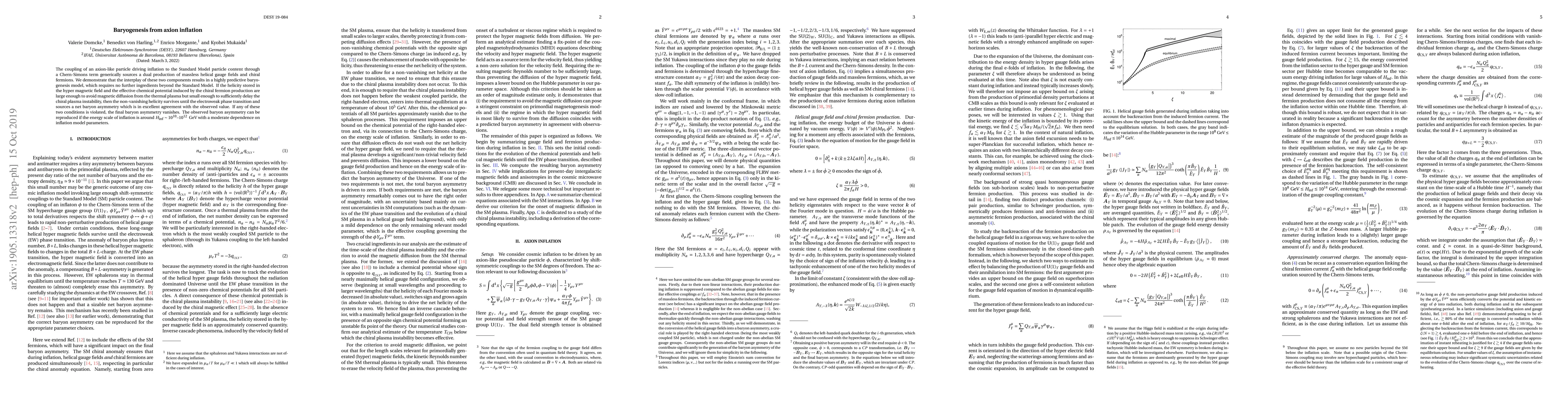 The coupling of an axion-like particle driving inflation to the Standard Model particle content through a Chern-Simons term generically sources a dual production of massless helical gauge fields and chiral fermions. We demonstrate that the interplay of these two components results in a highly predictive baryogenesis model, which requires no further ingredients beyond the Standard Model. If the helicity stored in the hyper magnetic field and the effective chemical potential induced by the chiral fermion production are large enough to avoid magnetic diffusion from the thermal plasma but small enough to sufficiently delay the chiral plasma instability, then the non-vanishing helicity survives until the electroweak phase transition and sources a net baryon asymmetry which is in excellent agreement with the observed value. If any of these two conditions is violated, the final baryon asymmetry vanishes. The observed baryon asymmetry can be reproduced if the energy scale of inflation is around $H_\text{inf} \sim 10^{10}$ - $10^{12}$ GeV with a moderate dependence on inflation model parameters.