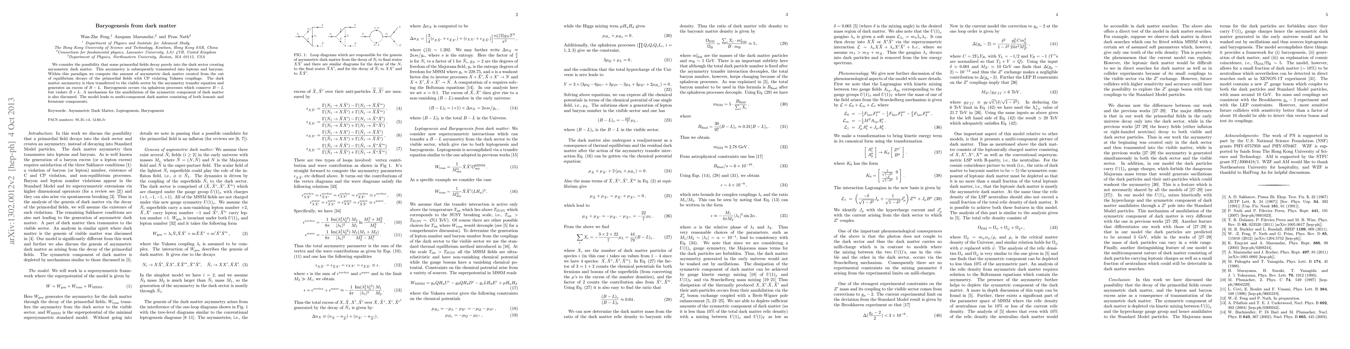 We consider the possibility that some primordial fields decay purely into the dark sector creating asymmetric dark matter. This asymmetry is subsequently transmuted into leptons and baryons. Within this paradigm we compute the amount of asymmetric dark matter created from the out of equilibrium decays of the primordial fields with CP violating Yukawa couplings. The dark matter asymmetry is then transferred to the visible sector by the asymmetry transfer equation and generates an excess of $B-L$. Baryogenesis occurs via sphaleron processes which conserve $B-L$ but violate $B+L$. A mechanism for the annihilation of the symmetric component of dark matter is also discussed. The model leads to multi-component dark matter consisting of both bosonic and fermionic components.